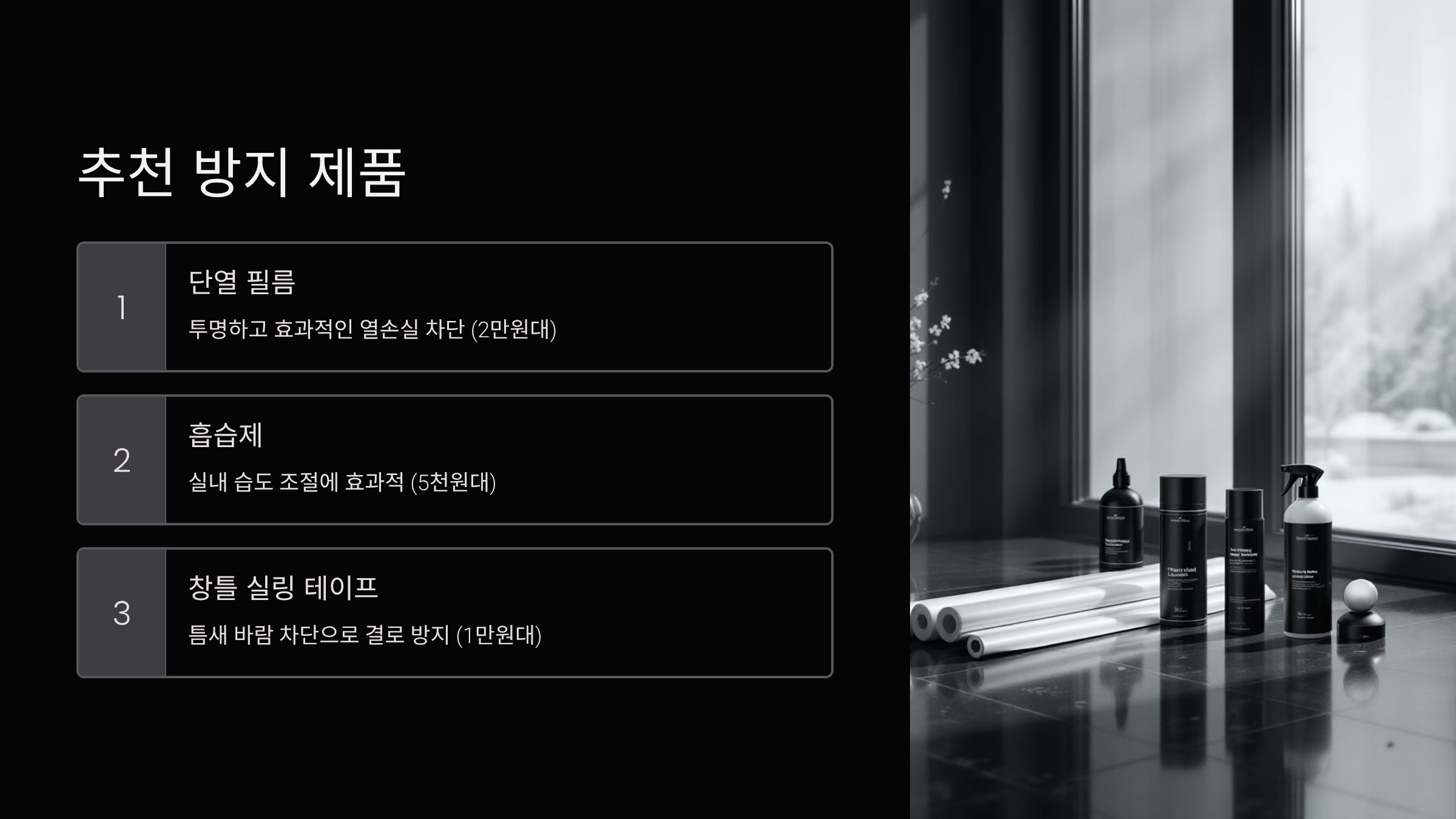 단열 필름도 인기 있는 제품이에요. 투명한 필름을 창문에 붙이면 단열 효과가 있어서 결빙을 줄여줘요. 시공이 조금 까다롭지만 한 번 붙이면 몇 년은 사용할 수 있어요. 열 차단율이 높은 제품일수록 효과가 좋은데, 가격도 그만큼 올라가요. 평당 2-5만 원 정도 하는데, 전문 시공을 받으면 더 비싸져요. DIY로 하면 비용을 절약할 수 있지만 기포가 생기지 않게 주의해야 해요.