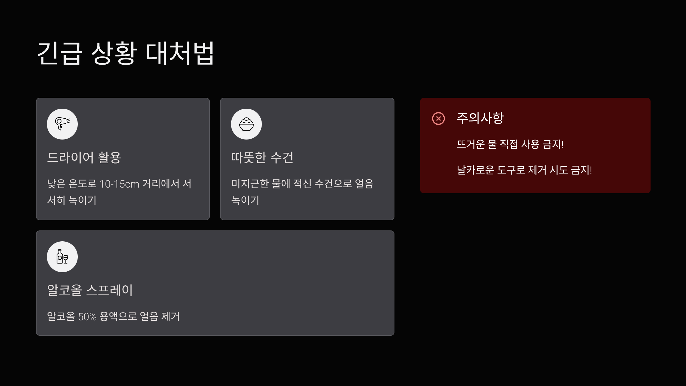 | 두꺼운 얼음 | 소금물 + 스크래퍼 | 플라스틱 도구 사용 |