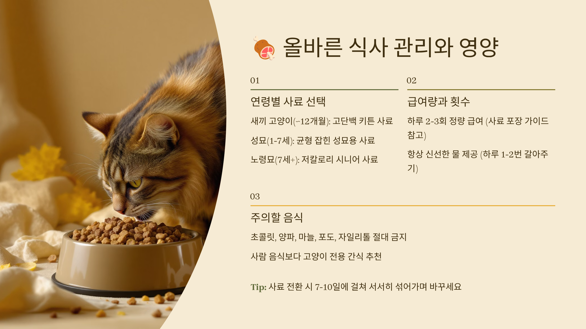 사료는 고양이의 나이와 건강 상태에 맞는 것으로 준비하세요. 새끼 고양이는 키튼 사료, 성묘는 어덜트 사료를 먹어야 해요. 처음에는 이전에 먹던 사료를 그대로 주고, 바꾸려면 일주일에 걸쳐 천천히 섞어가며 바꿔야 소화 문제가 생기지 않아요. 물은 항상 신선하게 유지하고, 여러 곳에 물그릇을 놓아두면 더 좋아요.