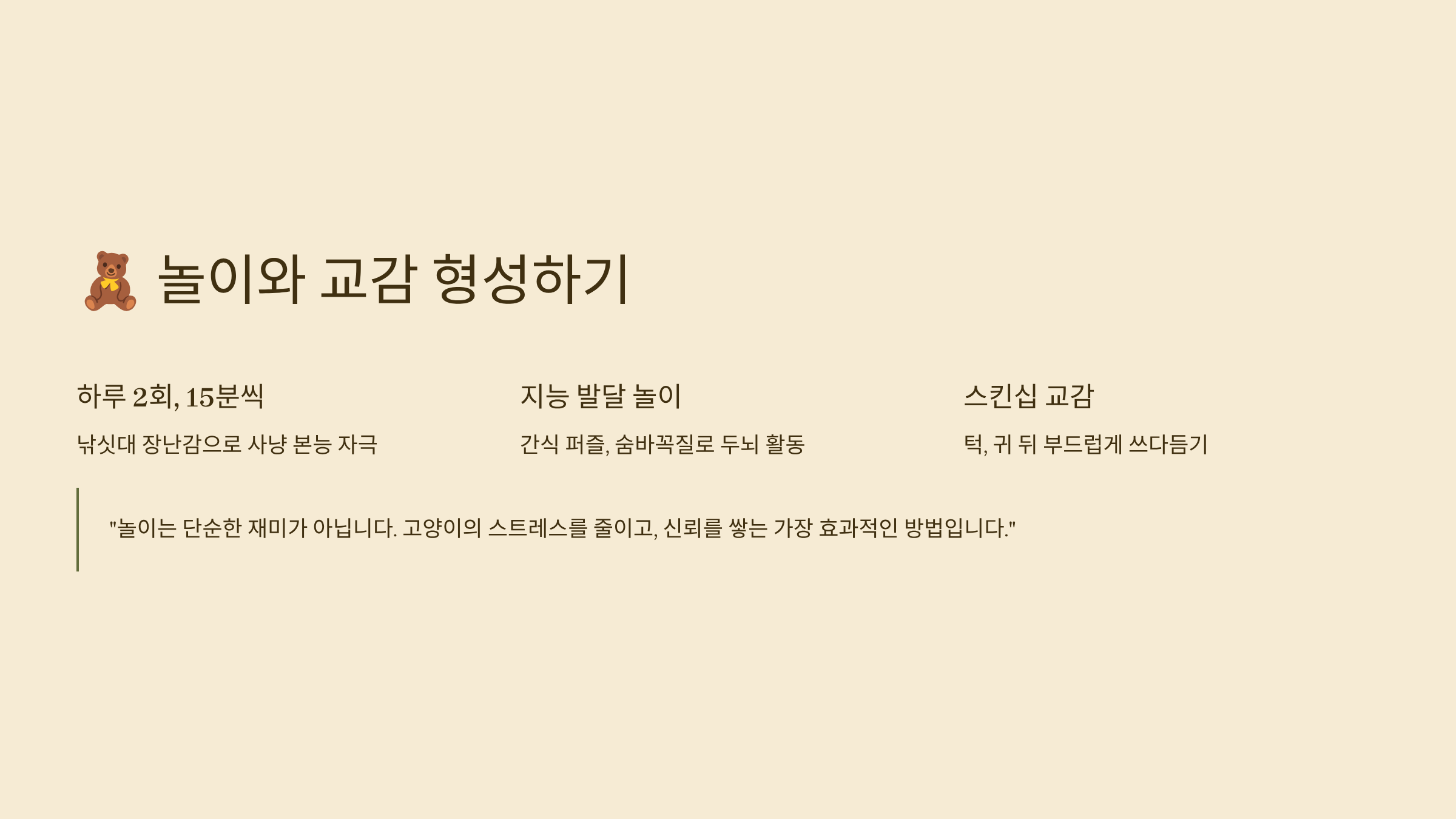 고양이와의 놀이는 단순한 재미를 넘어 운동과 스트레스 해소, 유대감 형성에 필수적이에요. 하루 최소 15-20분씩 두 번은 놀아주는 것이 좋아요. 특히 밥 먹기 전에 놀아주면 사냥-포획-식사의 자연스러운 본능을 충족시킬 수 있어요. 새벽에 깨우는 고양이라면 자기 전 충분히 놀아주면 숙면에 도움이 된답니다.
