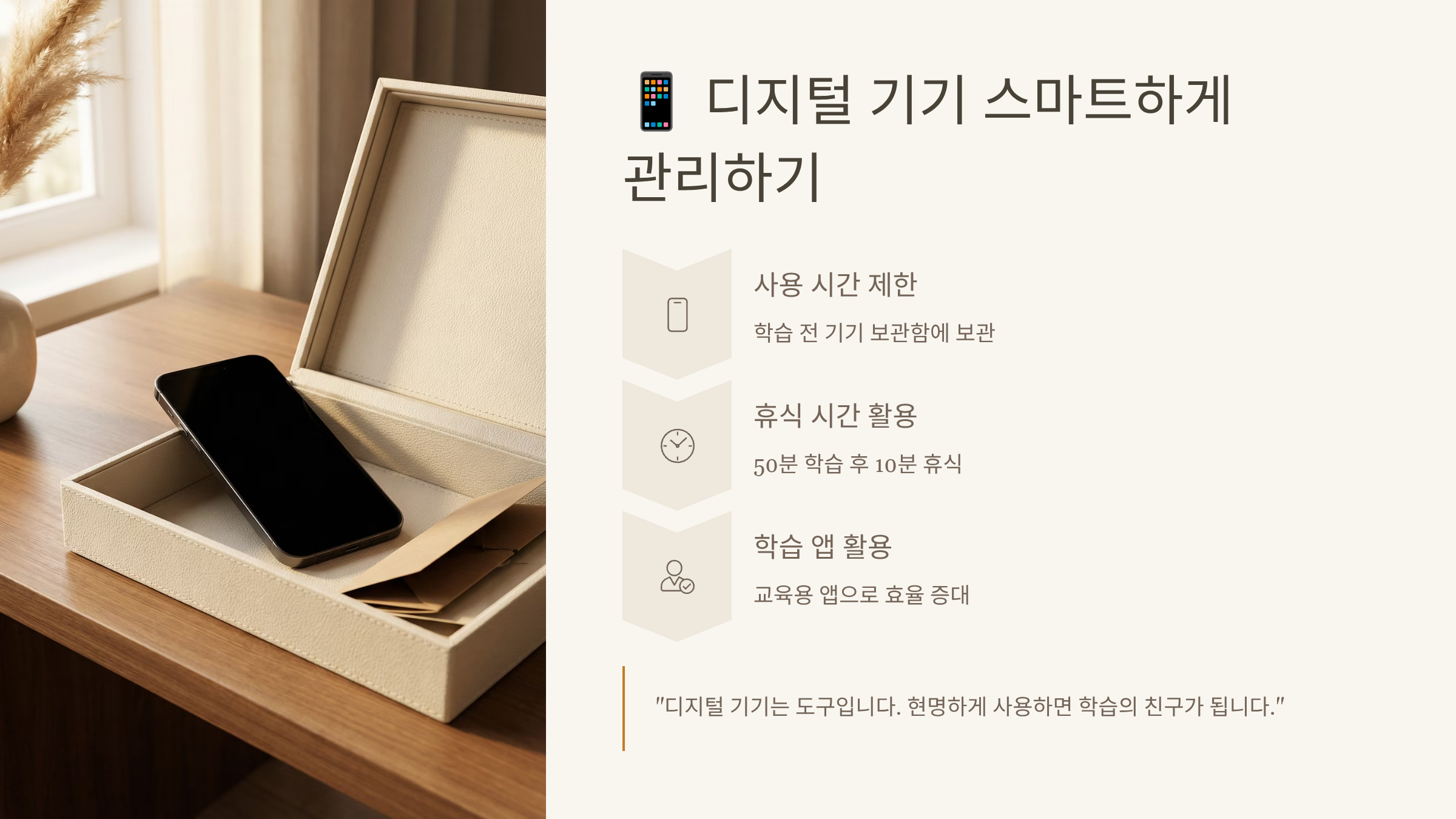 요즘 시대에 디지털 기기 없이 공부하기는 정말 어려워요. 온라인 수업, 디지털 교과서, 학습 앱 등 필수가 되어버렸죠. 하지만 동시에 가장 큰 방해 요소이기도 해요. 중요한 건 '차단'이 아니라 '관리'예요. 미국 스탠퍼드 대학의 연구에 따르면, 디지털 기기를 완전히 차단한 아이들보다 적절히 관리하며 사용한 아이들의 학업 성취도가 35% 더 높았어요.