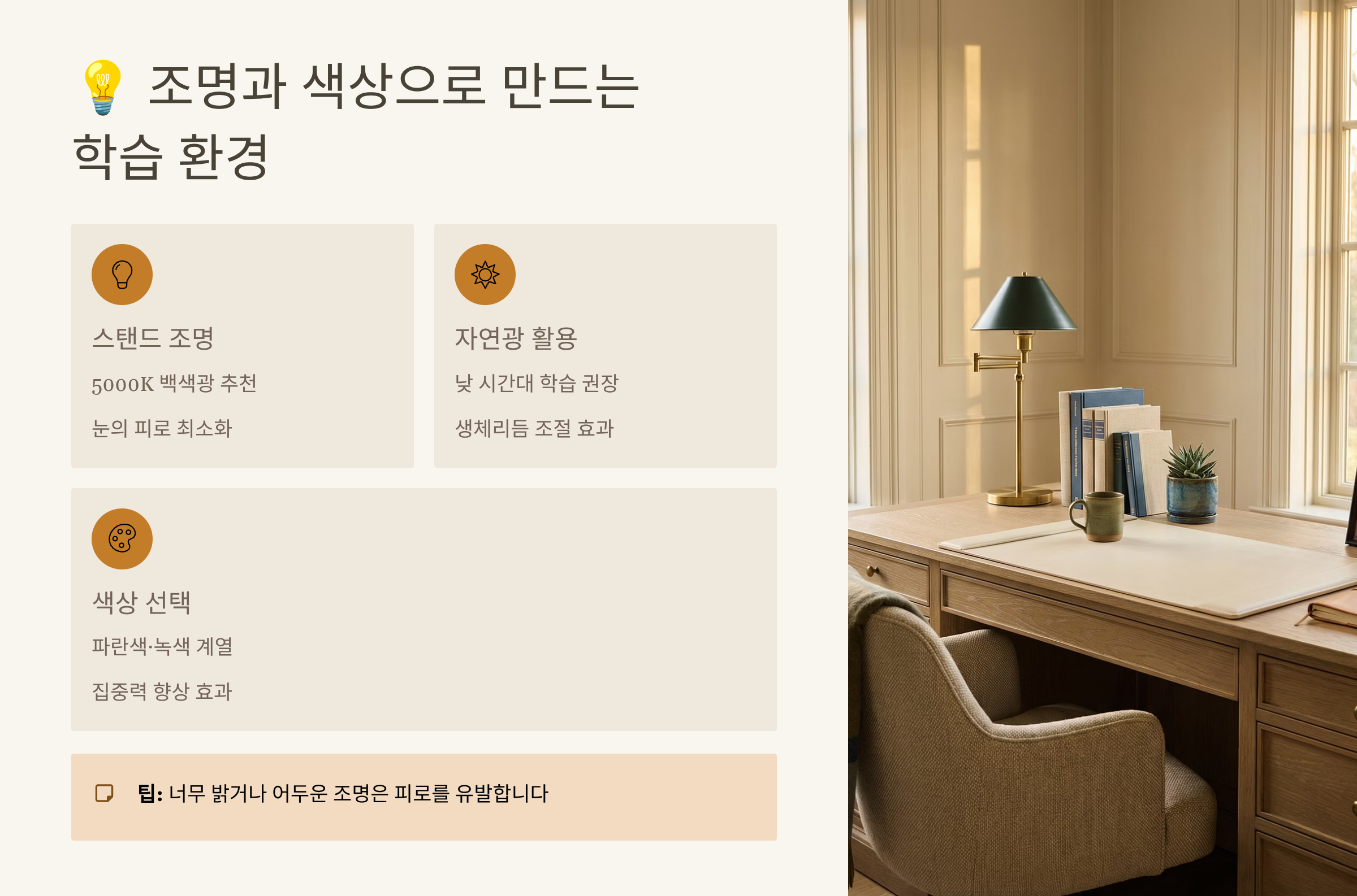 조명은 아이의 눈 건강과 집중력에 직접적인 영향을 미쳐요. 자연광이 가장 좋지만, 현실적으로 항상 자연광을 받을 수는 없죠. 그래서 인공조명 선택이 정말 중요해요. 색온도 5000K 정도의 주광색 LED가 학습에 가장 적합해요. 너무 노란빛은 졸음을 유발하고, 너무 하얀빛은 눈의 피로를 증가시켜요. 일본 도쿄대학 안과 연구팀에 따르면, 적절한 조명 아래서 공부한 아이들의 근시 진행률이 30% 낮았다고 해요.