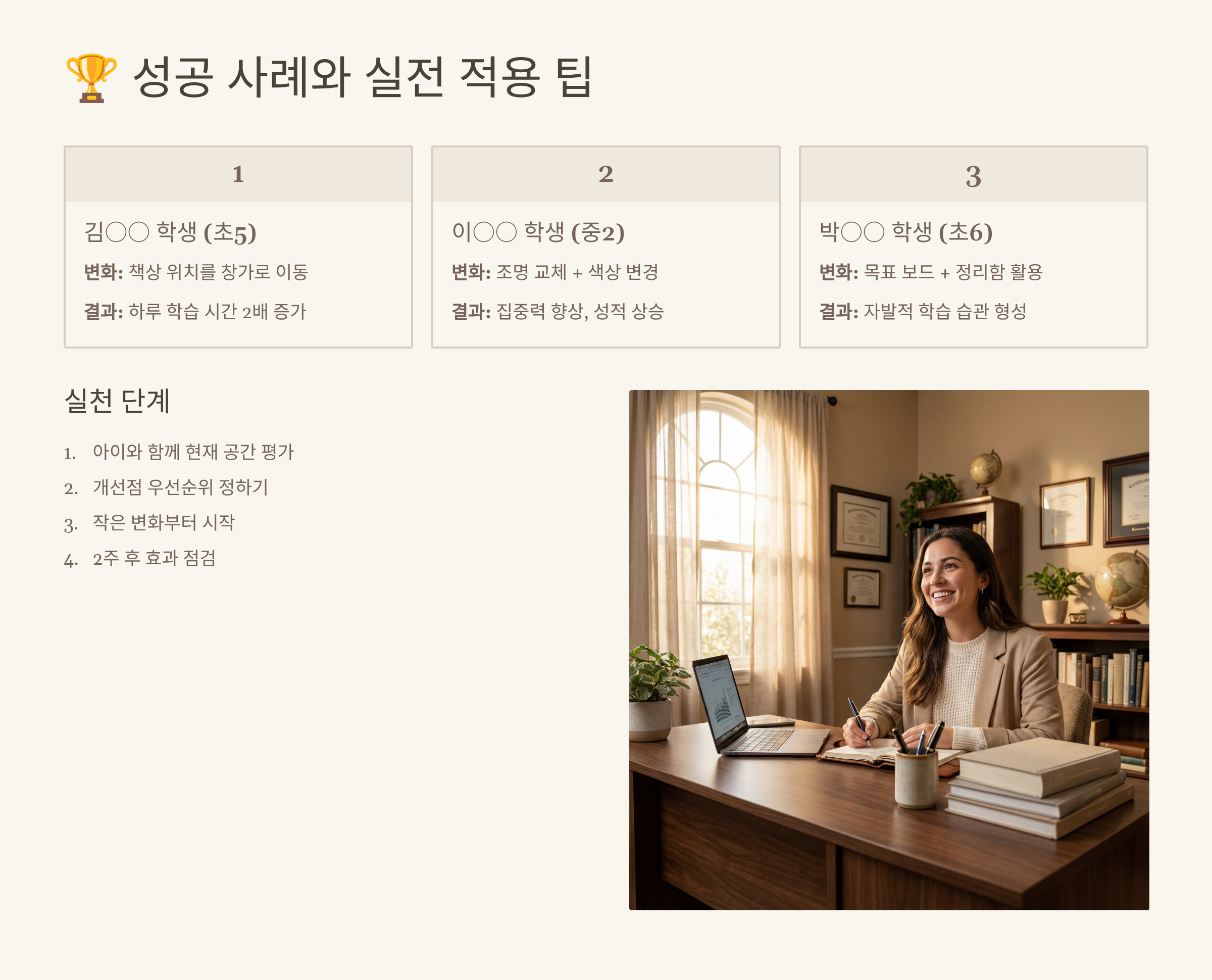 실제로 책상 환경을 바꿔서 성공한 사례들을 소개할게요. 서울의 한 초등학교 4학년 민준이는 하루 10분도 책상에 앉아있지 못했어요. 부모님이 아이와 함께 책상을 재배치하고, 민준이가 좋아하는 공룡 테마로 꾸며줬더니 놀라운 변화가 일어났어요. 3개월 후 민준이는 스스로 1시간씩 공부하게 되었고, 성적도 중위권에서 상위권으로 올라갔답니다. 핵심은 아이의 취향을 존중하고 함께 만들어간 것이었어요.