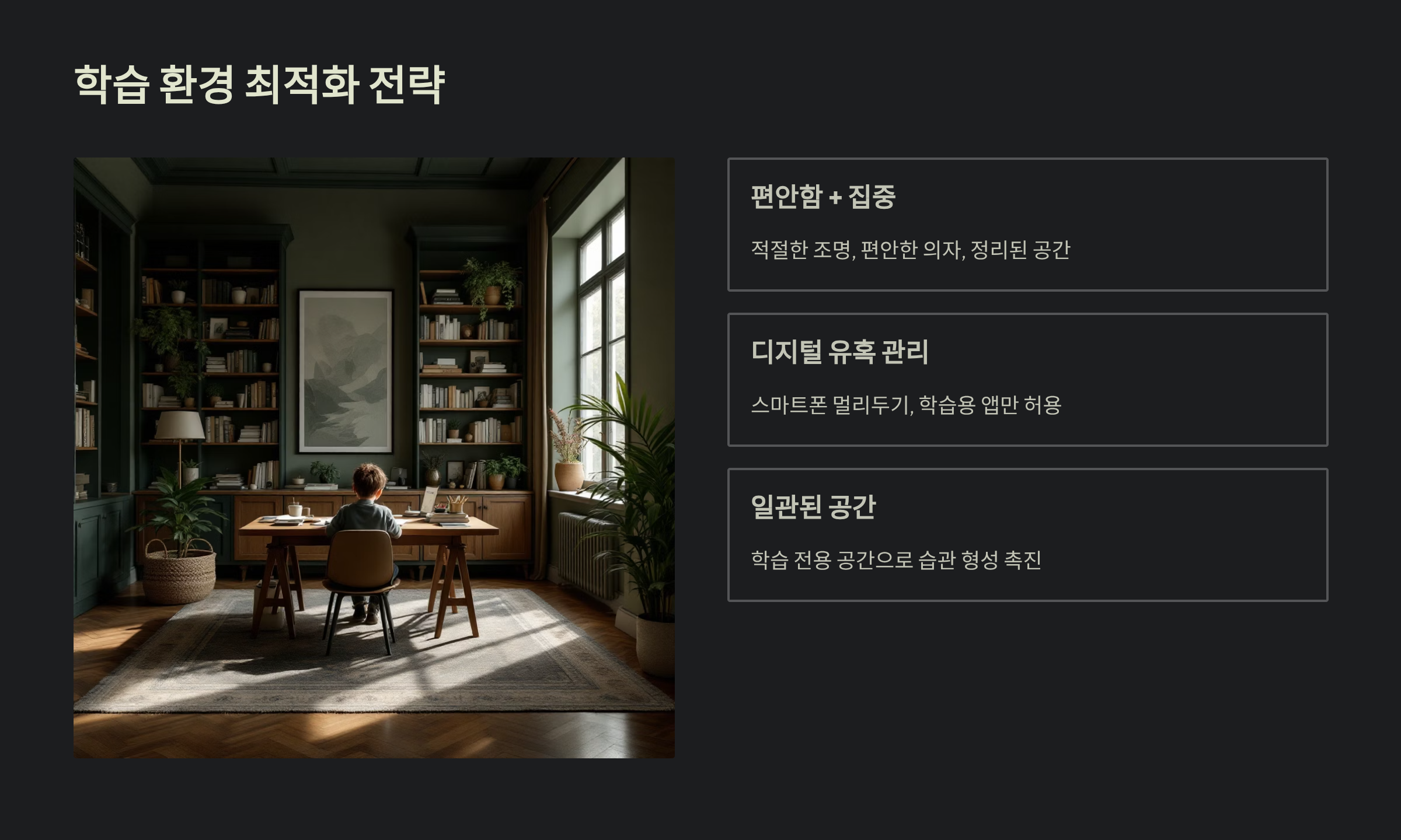 환경 단서를 전략적으로 배치하세요. 공부 시간이 되면 자동으로 켜지는 스탠드, 책상 위에 미리 펼쳐놓은 교재, 눈에 잘 띄는 곳에 붙인 시간표 등이 모두 환경 단서가 될 수 있어요. 반대로 방해 요소는 최대한 제거해야 해요. 스마트폰은 다른 방에 두고, 컴퓨터는 공부 시간에 전원을 꺼두는 것이 좋아요. 환경이 행동을 유도하도록 설계하면 의지력에 의존하지 않고도 습관을 만들 수 있답니다! 🏠