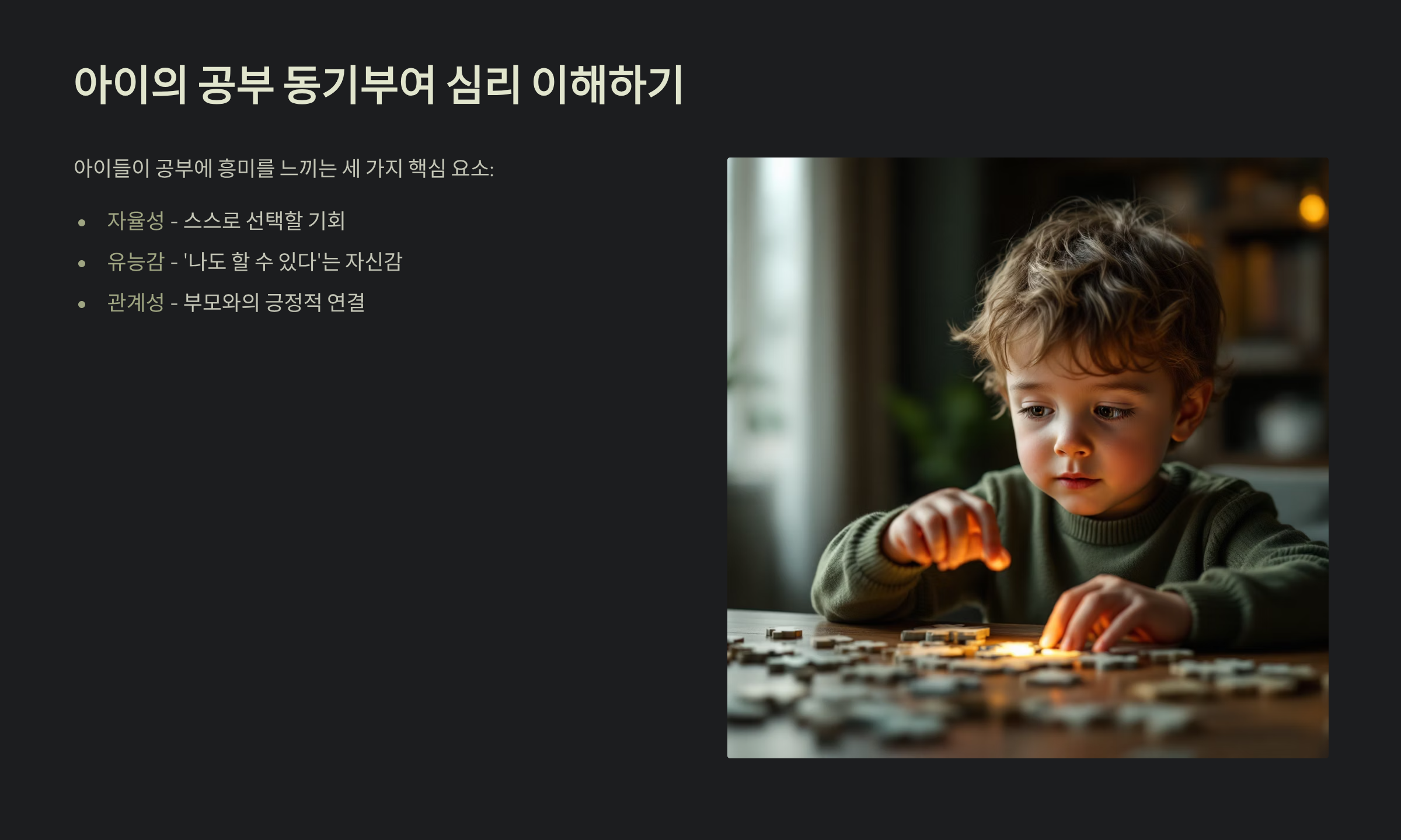 심리학자 에드워드 데시의 자기 결정이론에 의하면, 인간에게는 자율성, 유능감, 관계성이라는 세 가지 기본 욕구가 있어요. 아이들도 마찬가지로 이 세 가지가 충족될 때 내적 동기가 생긴답니다. 자율성은 스스로 선택할 수 있는 기회를 주는 것, 유능감은 작은 성공 경험을 쌓게 하는 것, 관계성은 부모와의 따뜻한 소통을 의미해요. 책상에 붙이는 메시지도 이 세 가지 요소를 고려해서 만들면 효과가 배가 된답니다! 🌈