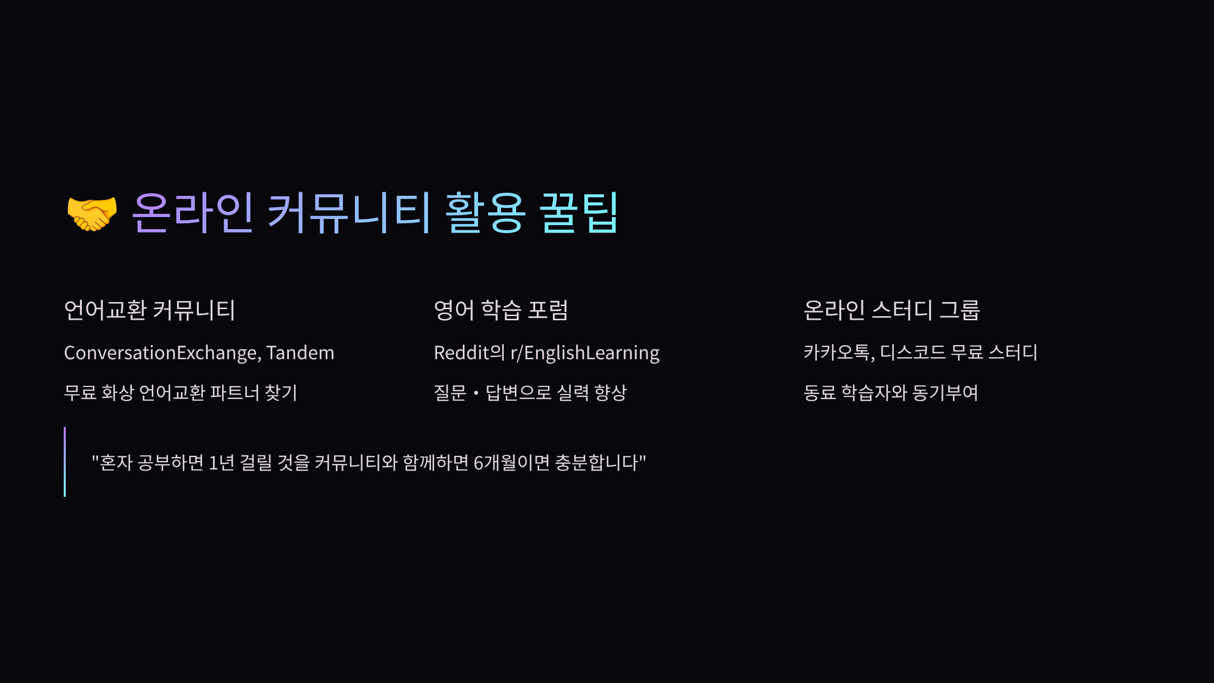 혼자 공부하다 보면 외롭고 동기부여가 떨어질 때가 있죠? 온라인 커뮤니티를 활용하면 함께 성장하는 즐거움을 느낄 수 있어요! 🌐 Reddit의 r/EnglishLearning 서브레딧은 전 세계 영어 학습자들이 모여 있는 곳이에요. 질문도 하고 경험도 공유하면서 동기부여를 받을 수 있답니다.