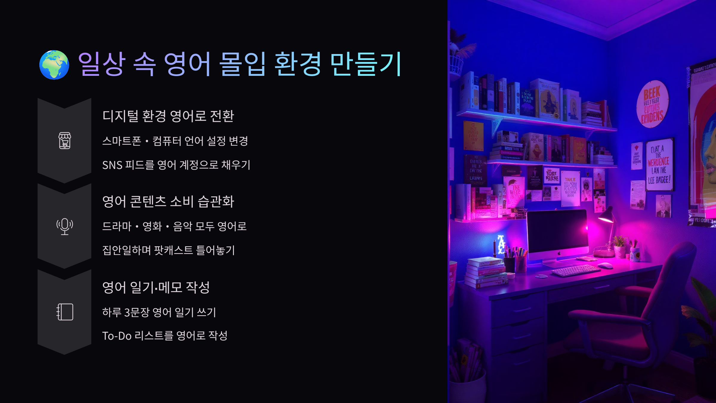 집에서도 해외에 있는 것처럼 영어 환경을 만들 수 있어요! 🏠 먼저 스마트폰, 컴퓨터, TV 등 모든 기기의 언어 설정을 영어로 바꿔보세요. 처음엔 불편하겠지만, 매일 보는 메뉴와 알림들이 자연스럽게 영어 학습 도구가 된답니다.
