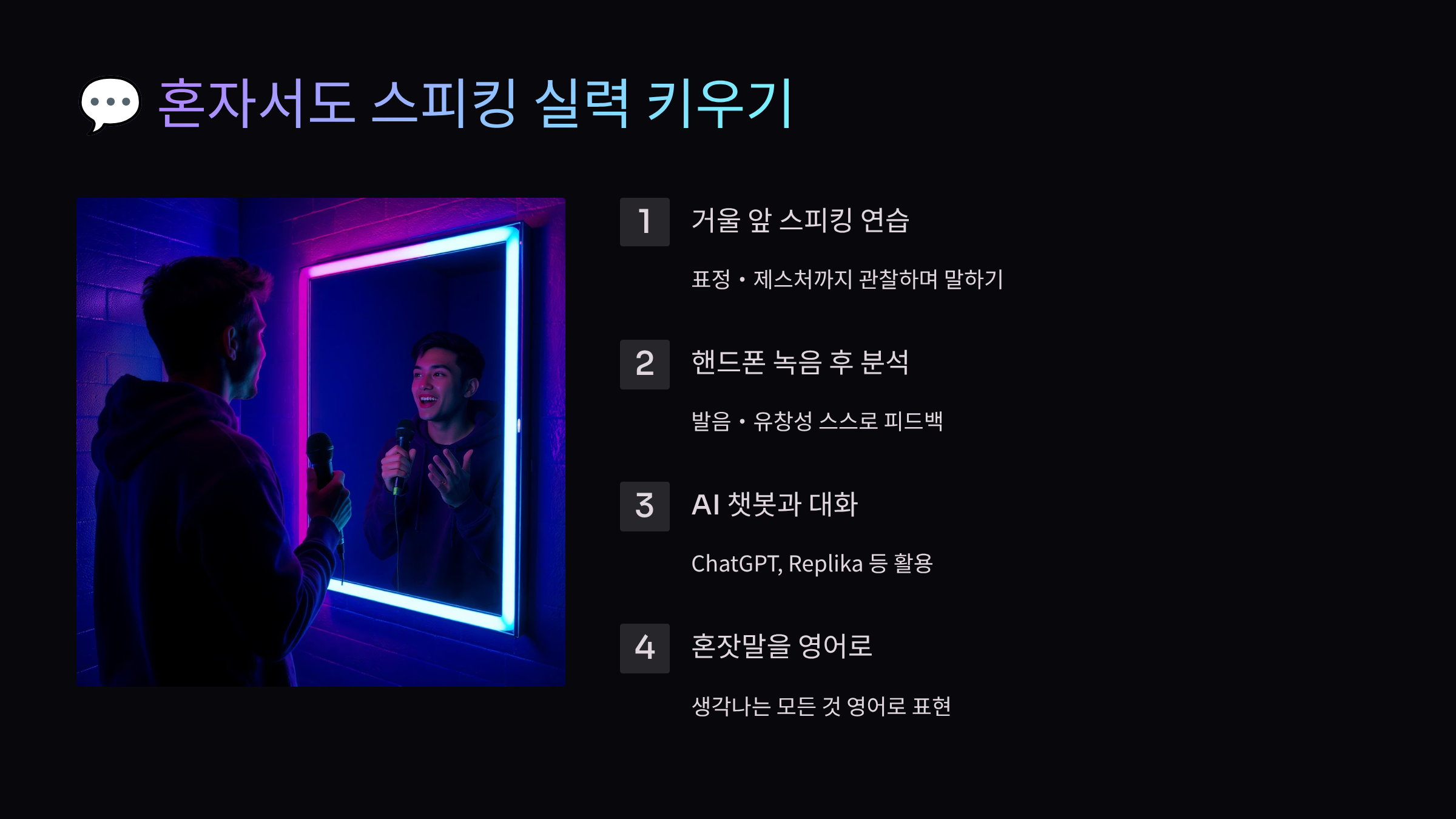 A4. AI 앱이나 음성인식 기능을 활용하세요! Google Assistant, Siri와 영어로 대화하거나, ChatGPT 음성 기능으로 연습할 수 있어요. 영어 뉴스나 유튜브 영상을 보고 요약해서 말하는 연습, 거울 보고 혼잣말하기도 효과적이에요. HelloTalk 같은 앱으로 음성 메시지 주고받는 것도 좋은 방법이랍니다!