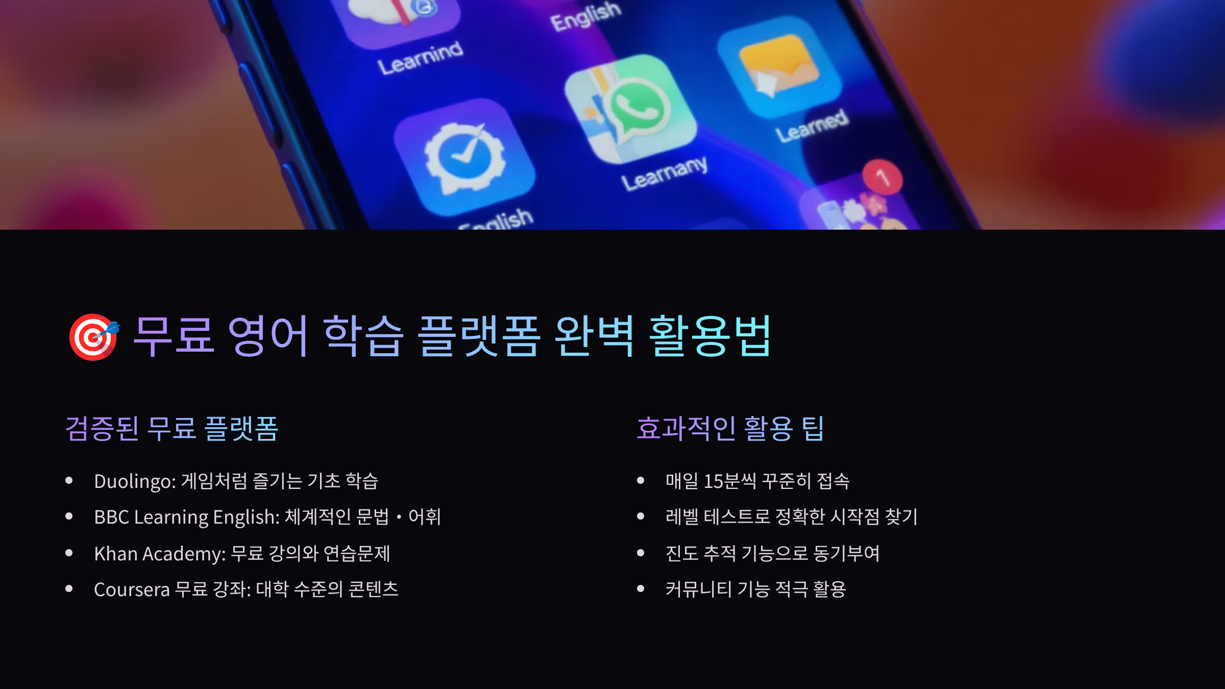 면책 조항: 본 글에서 제공하는 정보는 일반적인 영어 학습 가이드이며, 개인의 학습 속도와 결과는 다를 수 있습니다. 언급된 앱과 웹사이트의 무료 기능은 변경될 수 있으니 이용 전 확인하시기 바랍니다.