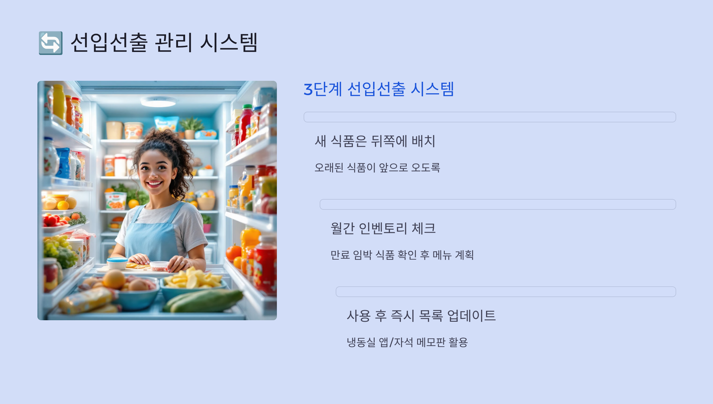 A8. '원 아웃 원 인(one out, one in)' 원칙을 지키세요. 새로운 것을 넣기 전에 오래된 것을 먼저 사용하는 거예요. 매주 일요일 10분만 투자해서 간단히 점검하고, 월 1회는 전체 정리를 하세요. 가족 모두가 정리 규칙을 알고 지킬 수 있도록 냉장고에 간단한 가이드를 붙여두는 것도 좋아요. 무엇보다 완벽하지 않아도 괜찮다는 마음가짐이 중요해요. 조금씩 개선해 나가면 된답니다! 😊