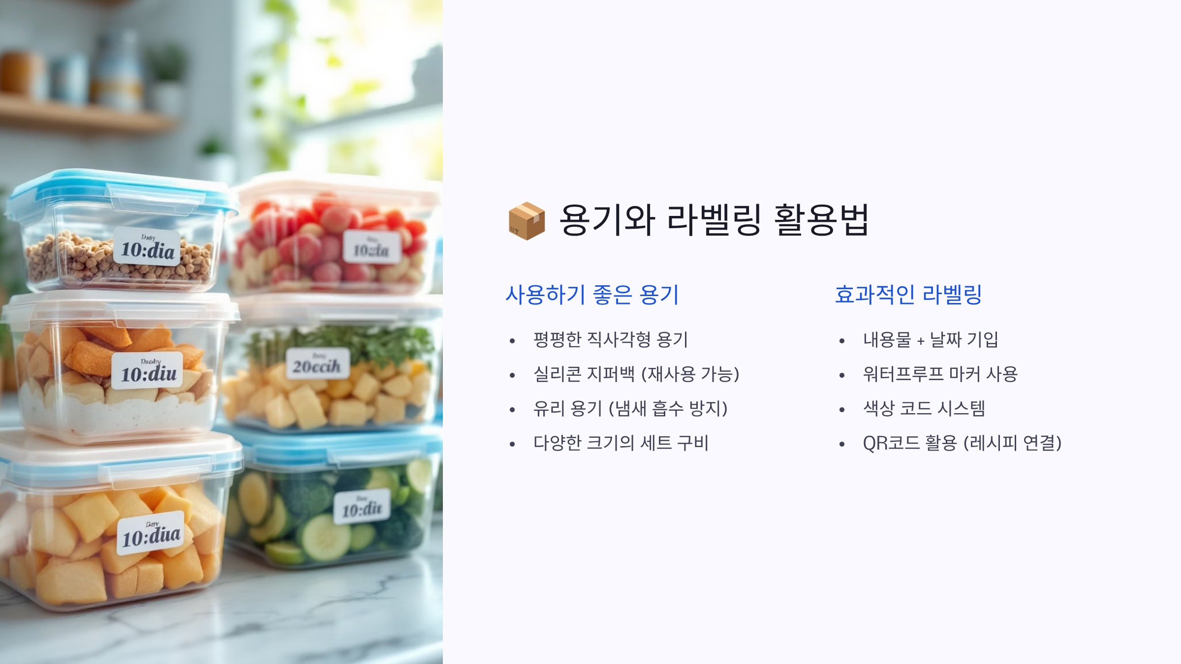 냉동실 정리의 핵심은 적절한 용기 선택이에요. 유리 용기는 환경 친화적이고 냄새가 배지 않는 장점이 있지만, 급격한 온도 변화에 깨질 수 있어요. 내열 유리 용기를 선택하고, 뚜껑을 살짝 열어두었다가 완전히 얼린 후 닫는 것이 안전해요. 플라스틱 용기는 가볍고 깨지지 않아 실용적이지만, BPA-free 제품을 선택하는 것이 건강에 좋답니다.