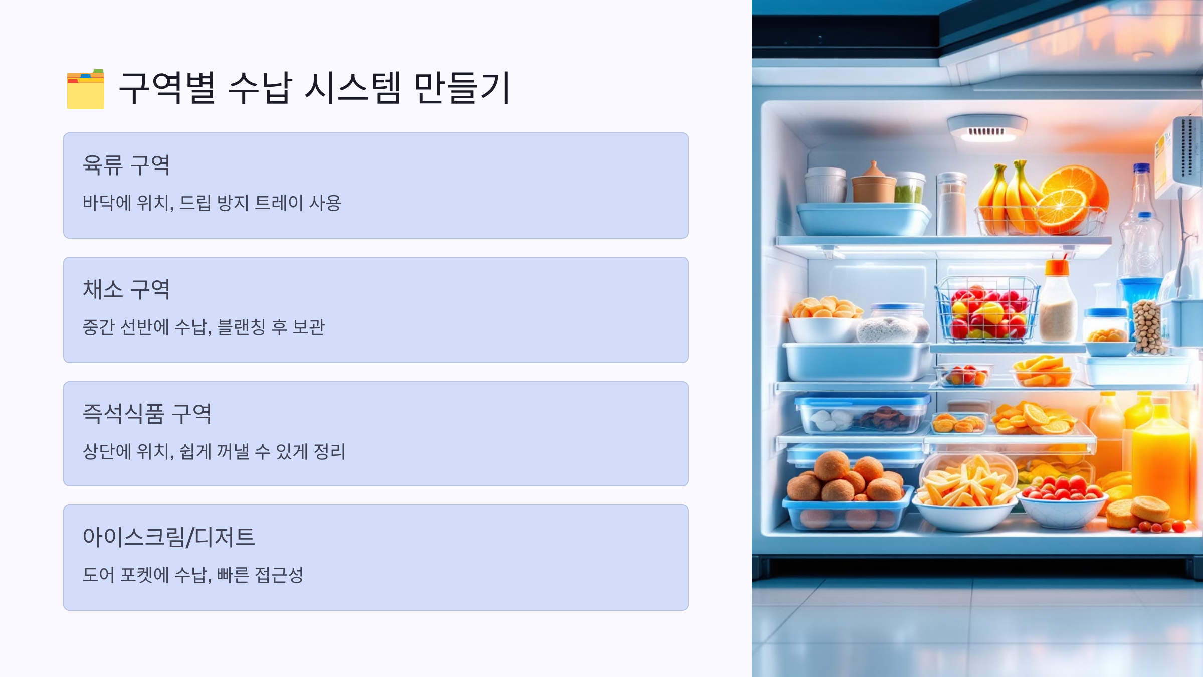 냉동실을 구역별로 나누는 것은 정리의 핵심이에요. 상단, 중단, 하단으로 나누고 각 구역마다 특정 식재료를 배치하면 훨씬 효율적이에요. 상단에는 자주 사용하는 아이스크림이나 냉동 과일을, 중단에는 육류와 해산물을, 하단에는 장기 보관 식품을 배치하는 것이 일반적이에요. 이렇게 하면 무거운 것을 들어 올릴 필요도 없고 찾기도 쉬워진답니다.