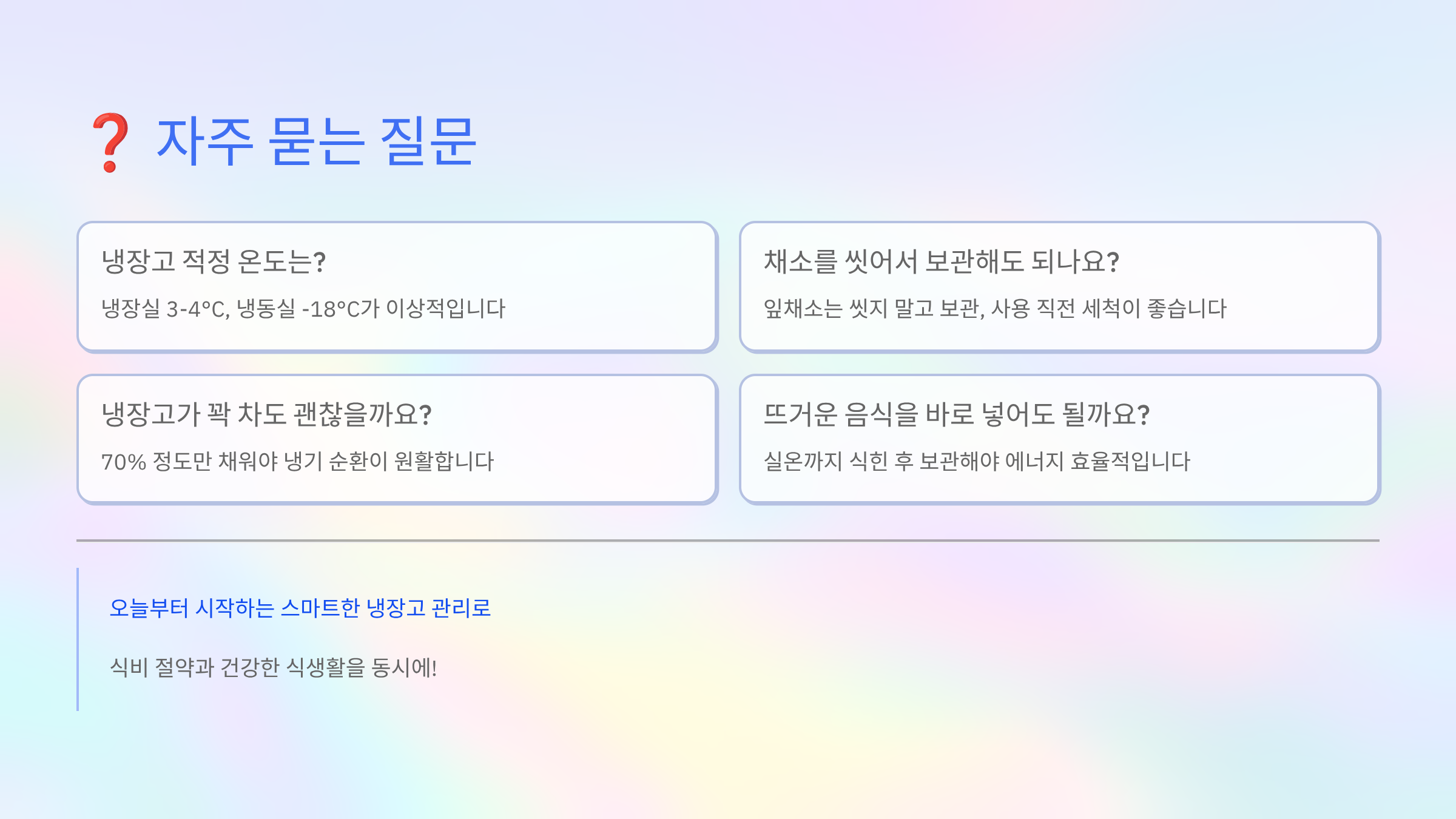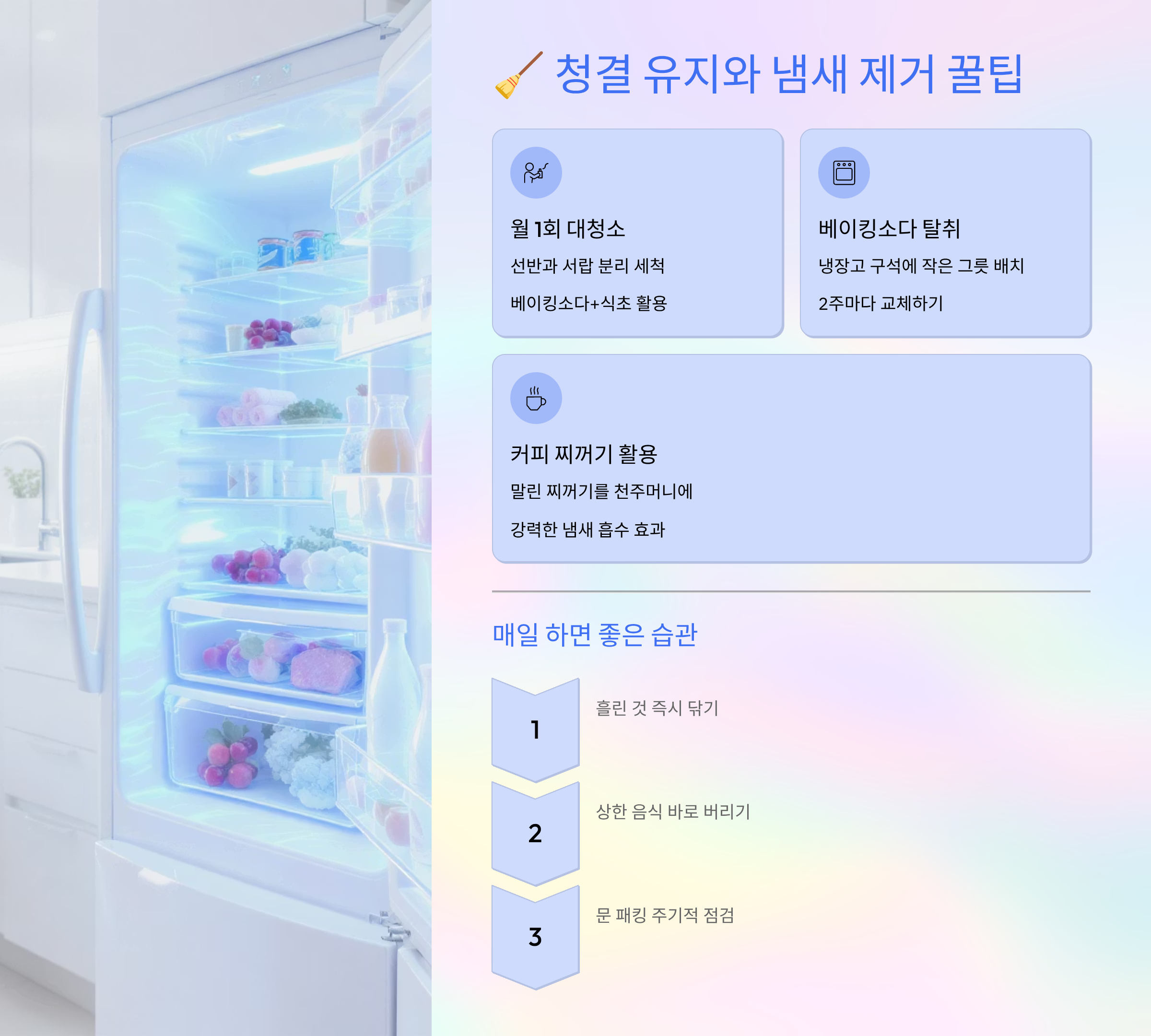 냉장고 정리는 단순한 수납이 아니라 삶의 질을 높이는 투자예요. 처음엔 번거로워 보이지만, 한 번 시스템을 만들어두면 매일이 편해지고 행복해집니다. 오늘부터 하나씩 실천해 보세요. 냉장고를 열 때마다 미소 짓는 당신을 만날 수 있을 거예요! 🌟