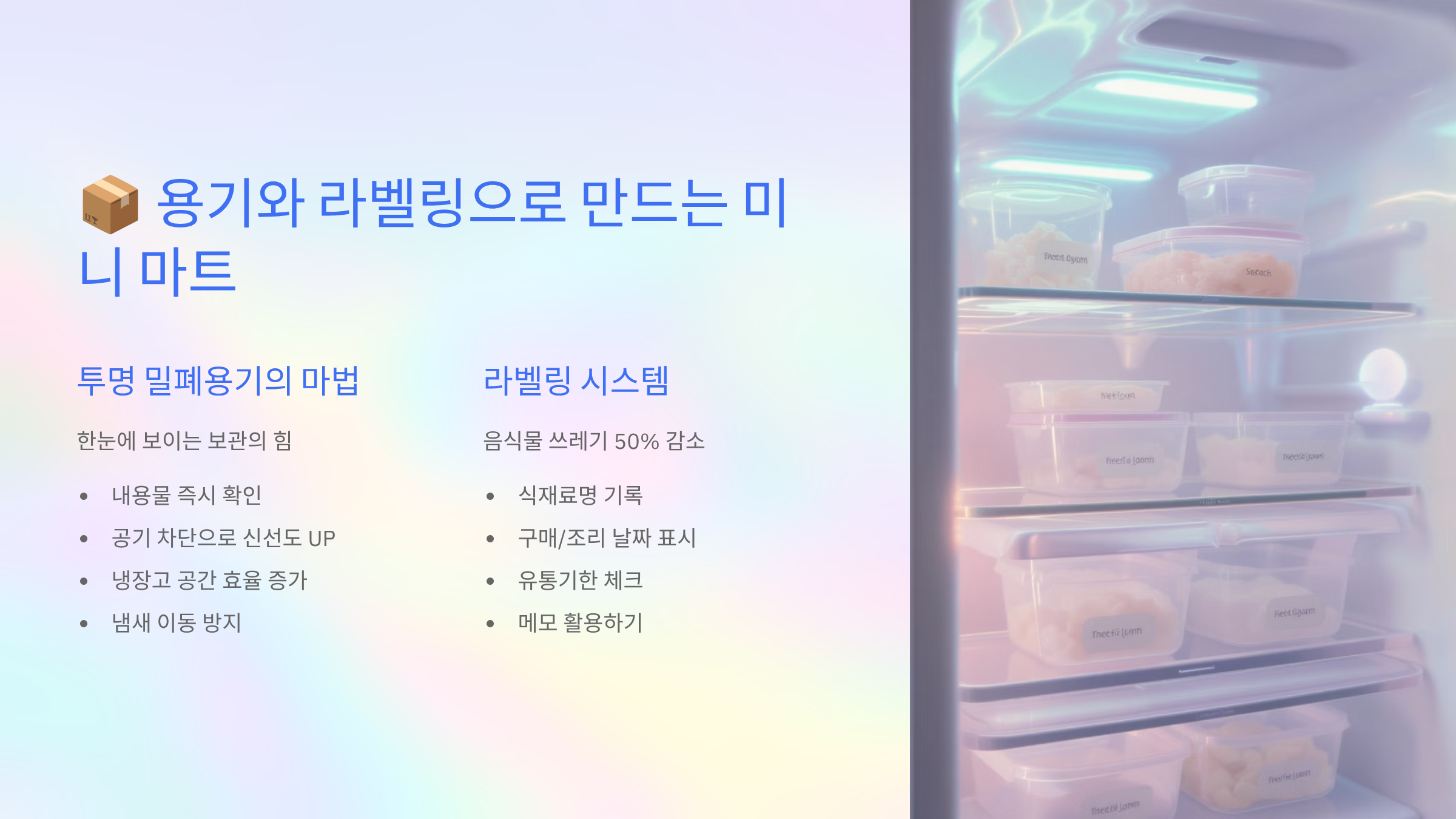 색깔별로 구분하는 것도 좋은 방법이에요. 예를 들어 빨간색 용기는 육류, 파란색은 해산물, 초록색은 채소 이런 식으로 정하면 가족 모두가 쉽게 찾을 수 있어요. 아이들도 색깔로 구분하면 스스로 정리하는 습관을 기를 수 있답니다! 🌈