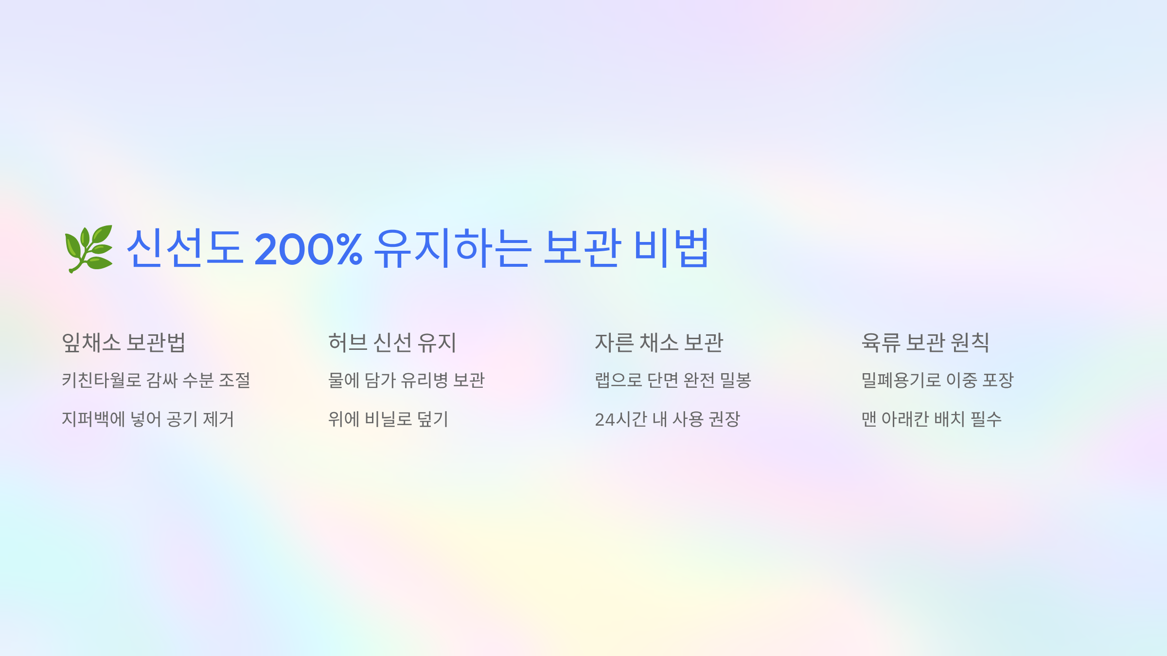 잎채소는 수분 관리가 핵심이에요. 상추나 시금치는 씻은 후 물기를 완전히 제거하고 키친타월로 감싸서 보관하면 일주일 이상 신선하게 유지돼요. 대파는 뿌리 부분을 물에 담가두면 계속 자라면서 오래 사용할 수 있어요. 이건 정말 신기한 방법이죠! 🌱