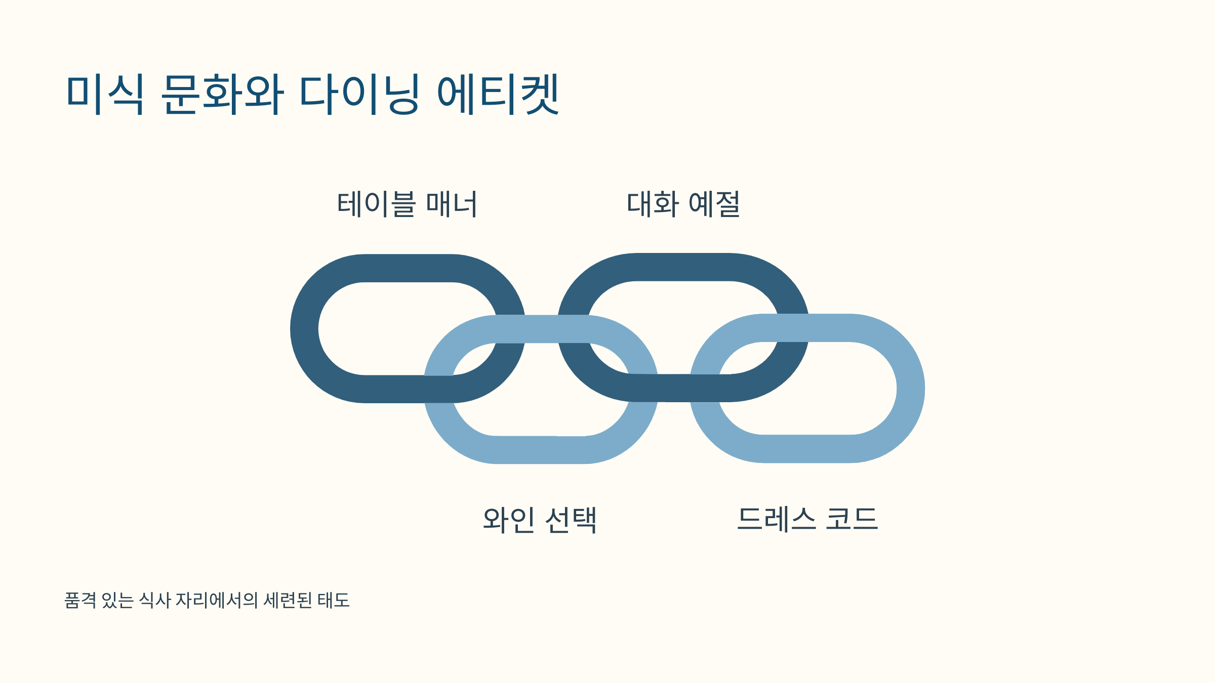 파인 다이닝 레스토랑에서의 에티켓은 중요해요. 드레스 코드를 준수하고, 예약 시간을 지키며, 휴대폰은 무음으로 설정하는 것이 기본이죠. 테이블 매너도 중요한데, 나이프와 포크는 바깥쪽부터 사용하고, 냅킨은 무릎 위에 펼쳐 놓으며, 와인 잔은 스템을 잡는 것이 올바른 방법이에요. 이런 에티켓은 단순한 격식이 아니라 함께 식사하는 사람들에 대한 배려와 존중의 표현이랍니다.