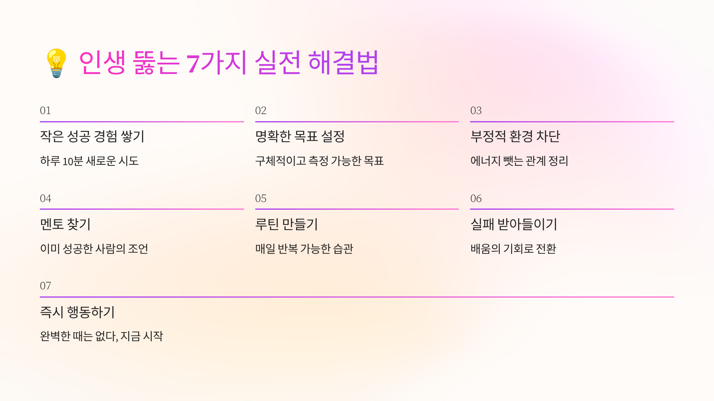 여섯 번째 해결법은 '학습과 성장'이에요. 새로운 기술을 배우거나 취미를 시작하세요. 온라인 강의, 독서, 워크숍 참여 등을 통해 지속적으로 성장하세요. 배움은 뇌를 활성화시키고 새로운 가능성을 열어줘요. 하루 30분만 투자해도 1년이면 전문가가 될 수 있어요.