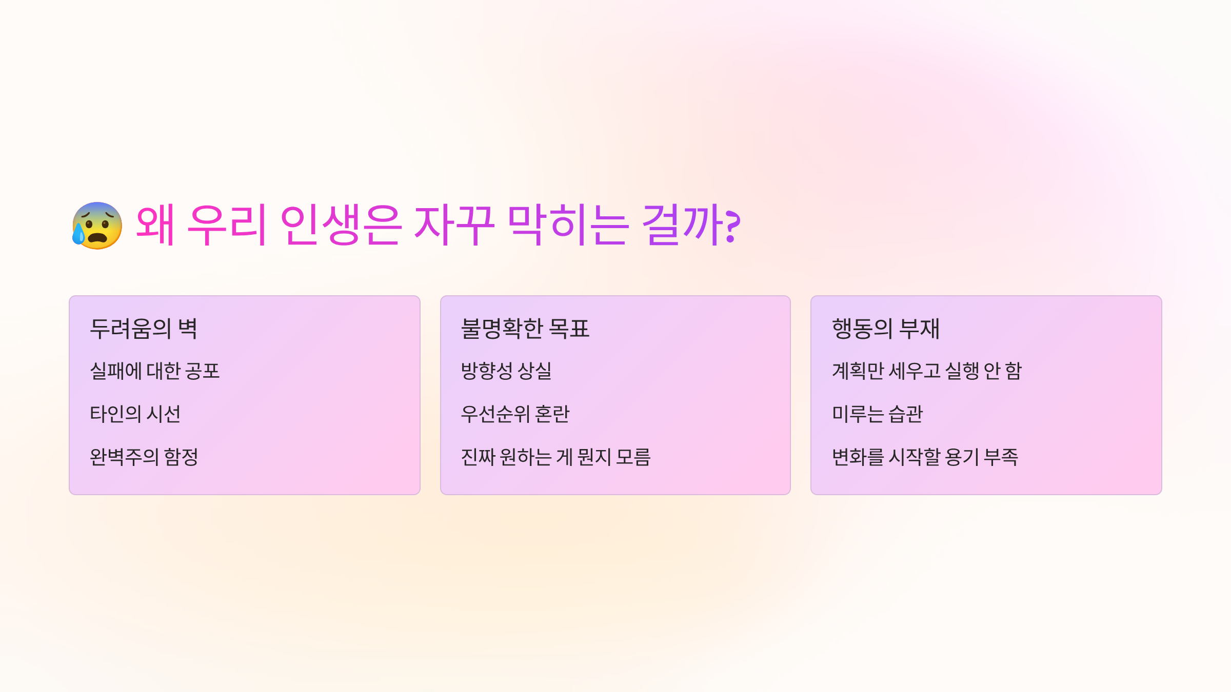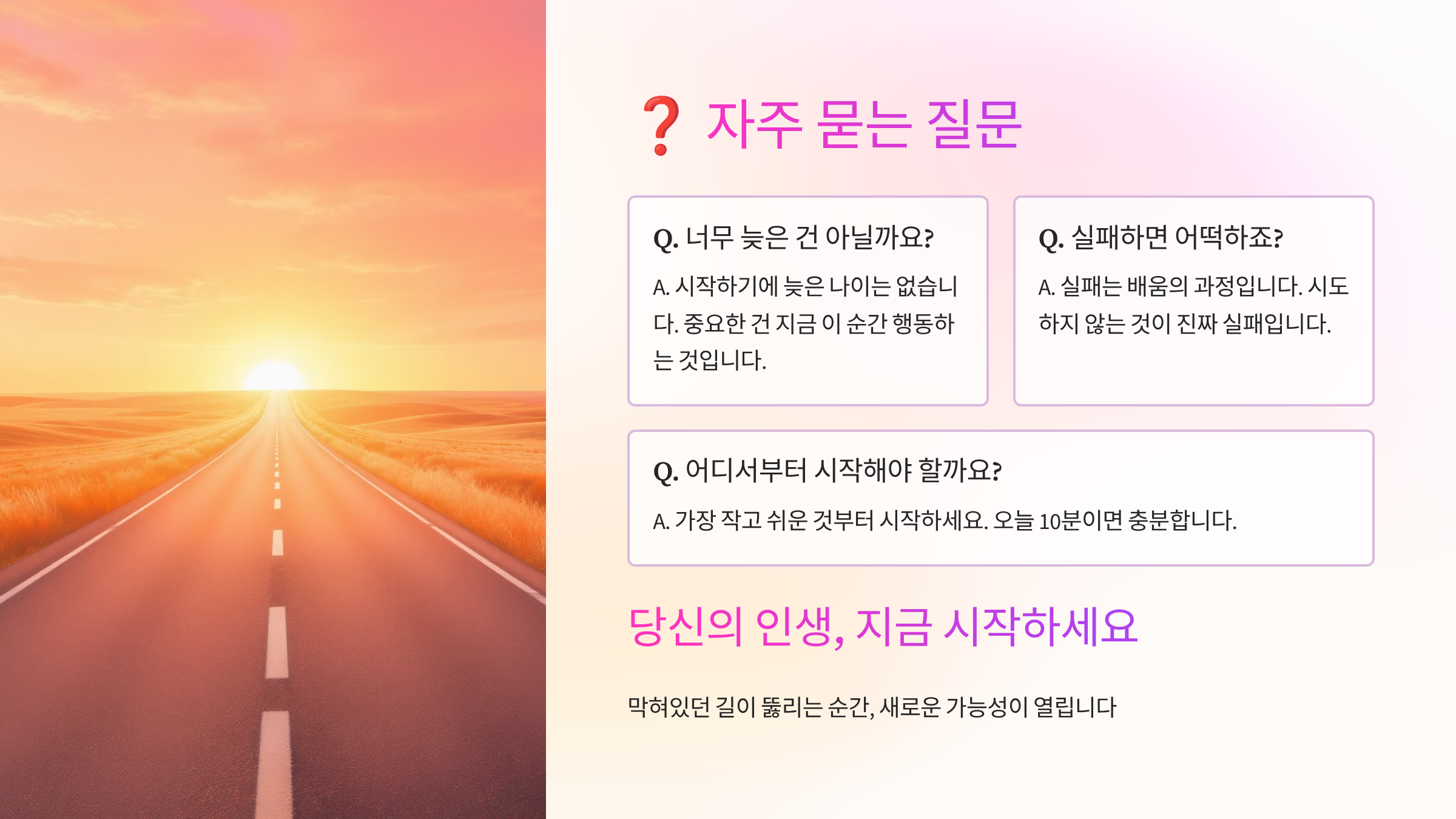 지금 당장 시작할 수 있는 것들이 있어요. SNS 시간 줄이기, 새로운 시도하기, 목표 공유하기... 이 모든 것이 당신의 삶을 바꿀 씨앗이 될 수 있어요. 변화는 선택이 아니라 필수예요. 막힌 인생을 그대로 두면 더 막히지만, 작은 구멍이라도 뚫으면 물이 흐르기 시작해요.