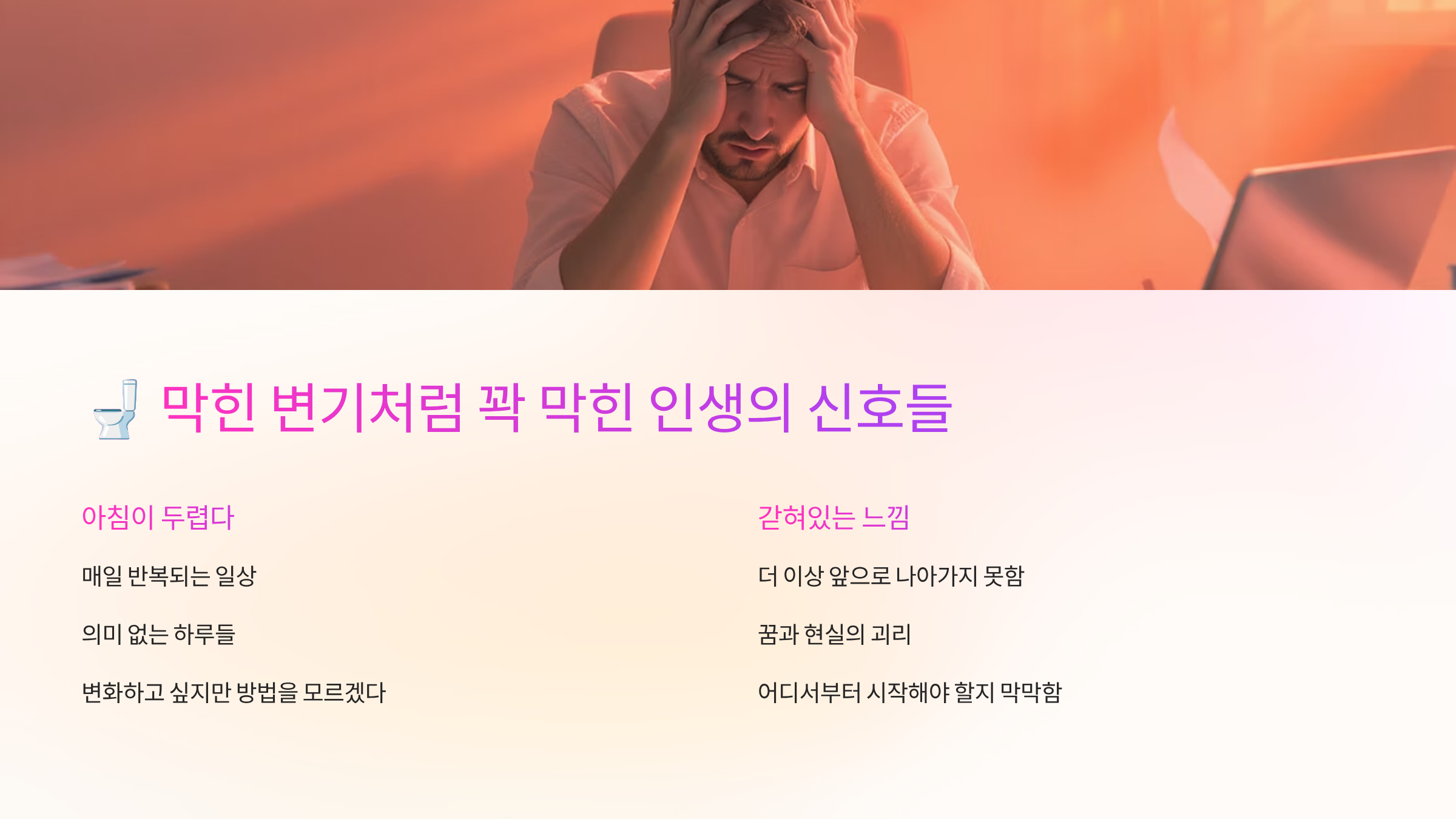 막힌 변기는 뚫어뻥으로 해결하지만, 막힌 인생은 작은 행동의 변화로 시작됩니다. 매일 5분 명상, 감사 일기 3줄, 걷기 5000보... 이런 작은 습관이 쌓여 큰 변화를 만들어요. 무기력감, 반복되는 실패, 미래 불안은 모두 극복 가능한 신호들이에요.