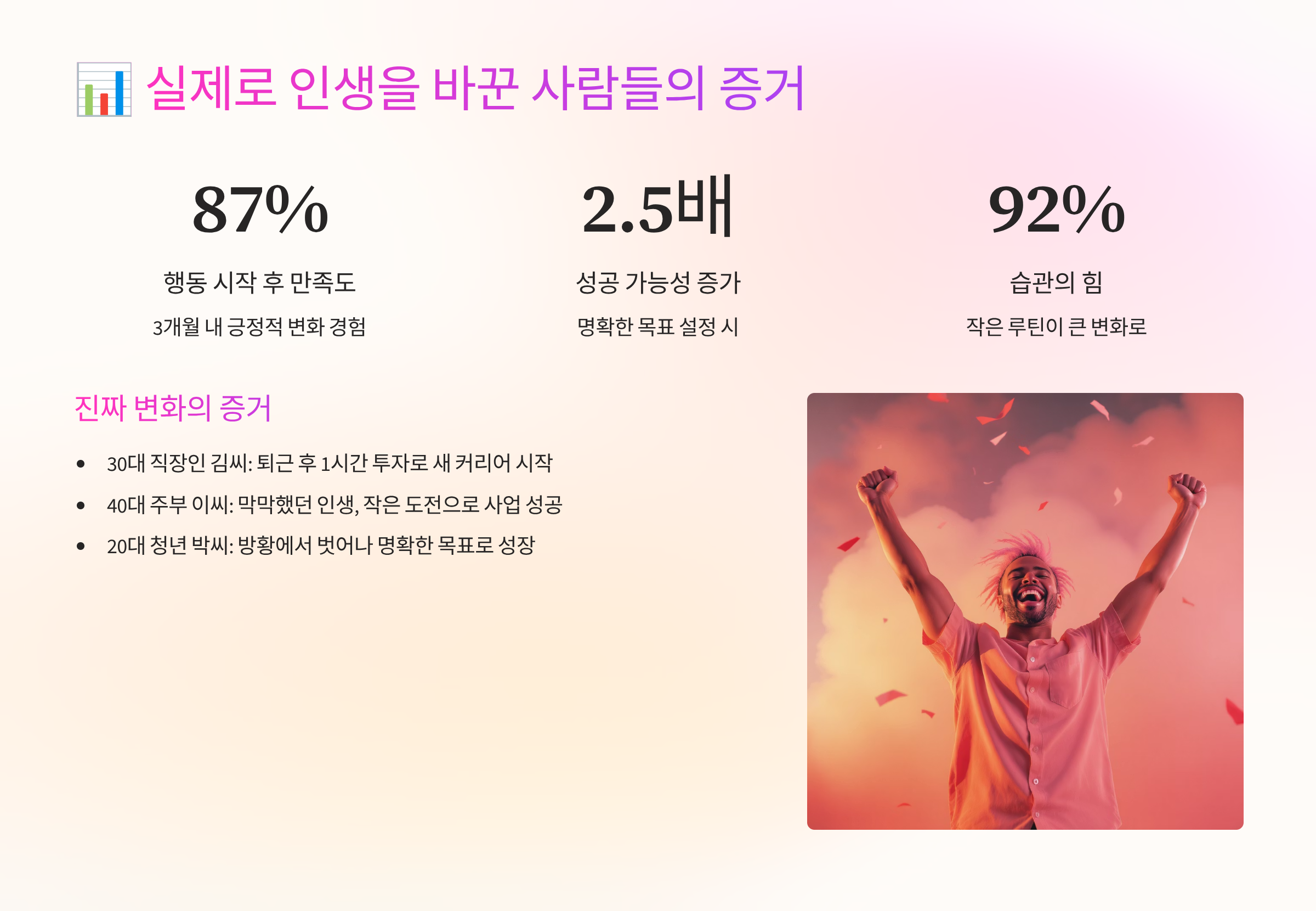 심리학자 마틴 셀리그만의 연구는 학습된 무기력을 극복한 사람들이 평균적으로 더 행복하고 성공적인 삶을 산다는 것을 보여줘요. 특히 감사 일기를 쓴 그룹은 그렇지 않은 그룹보다 행복도가 25% 높았어요. 작은 실천이 큰 변화를 만든다는 증거죠.