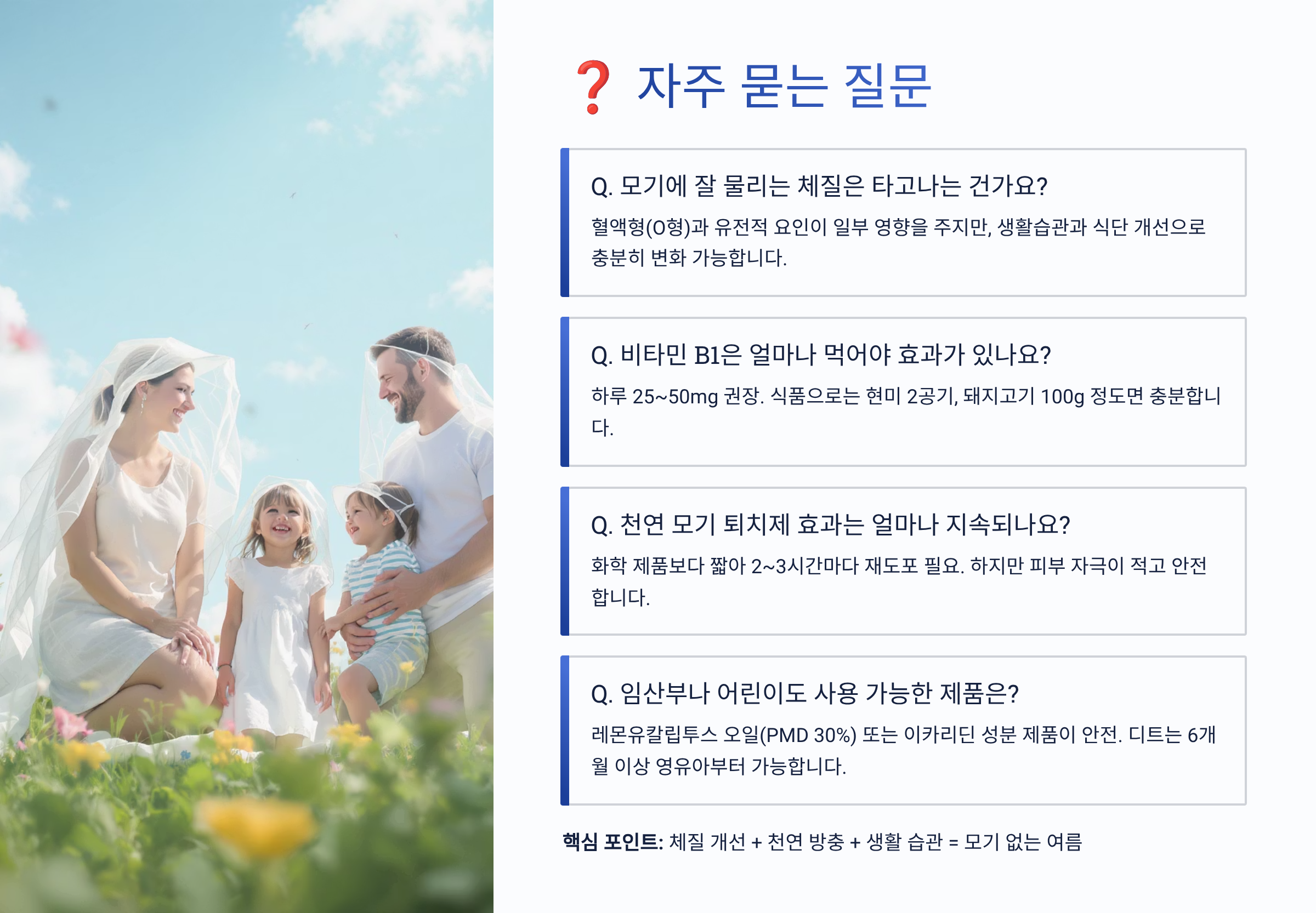 모기에게 인기 없는 사람이 되려면 체질 개선, 천연 퇴치법 활용, 생활 습관 개선, 적절한 옷차림, 최신 기술 활용 등 다양한 방법을 종합적으로 실천해야 해요. 특히 체온을 낮게 유지하고, 청결을 유지하며, 밝은 색 옷을 입는 것이 기본이에요. 라벤더나 유칼립투스 같은 천연 오일을 활용하고, 비타민 B1을 섭취하는 것도 도움이 됩니다. 무엇보다 자신의 생활 패턴과 환경에 맞는 방법을 찾아 꾸준히 실천하는 것이 중요해요. 이제 모기 걱정 없는 편안한 여름을 보내실 수 있을 거예요! 🦟✨