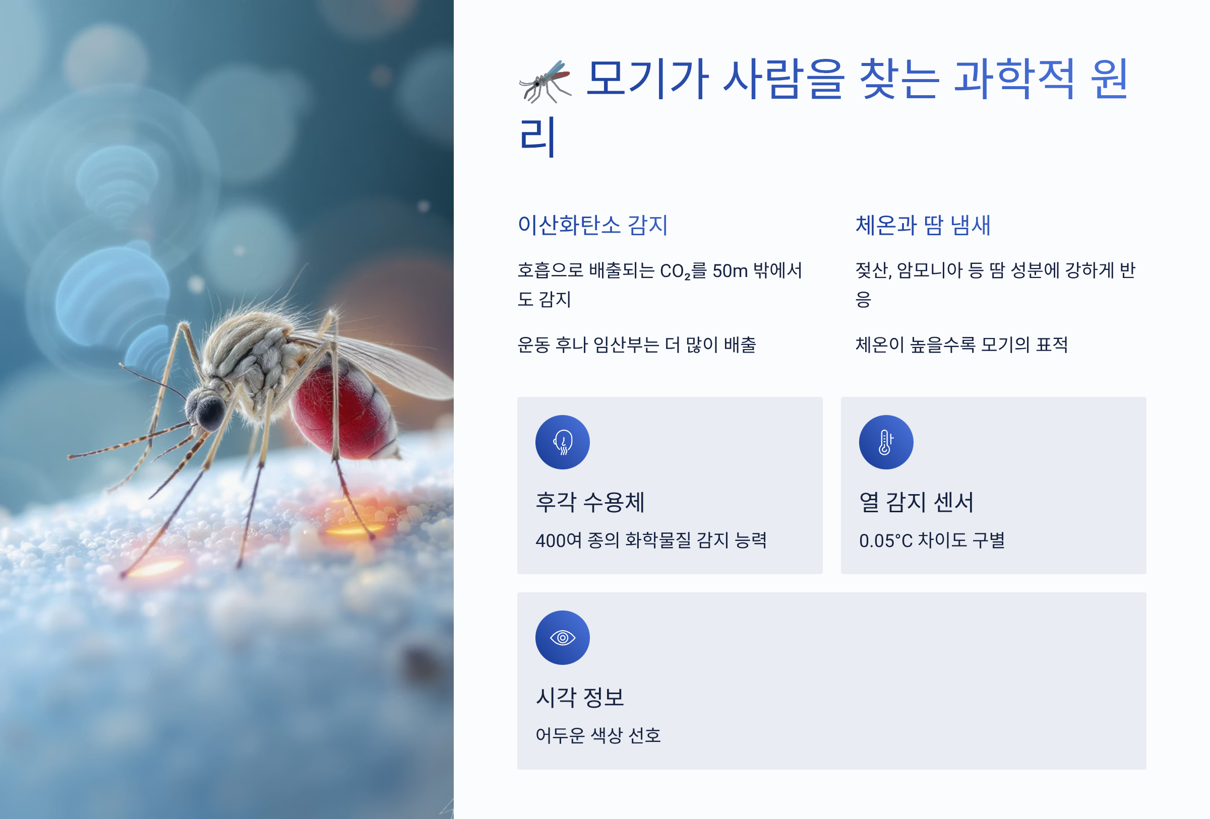 모기가 사람을 찾는 방법은 정말 놀라울 정도로 정교해요. 모기는 최대 50미터 떨어진 곳에서도 이산화탄소를 감지할 수 있답니다. 우리가 숨을 쉴 때마다 내뿜는 이산화탄소가 모기에게는 맛있는 식사를 알리는 신호가 되는 거예요. 게다가 모기의 더듬이에는 72가지 이상의 냄새 수용체가 있어서 우리 몸에서 나는 다양한 화학물질을 감지할 수 있어요.