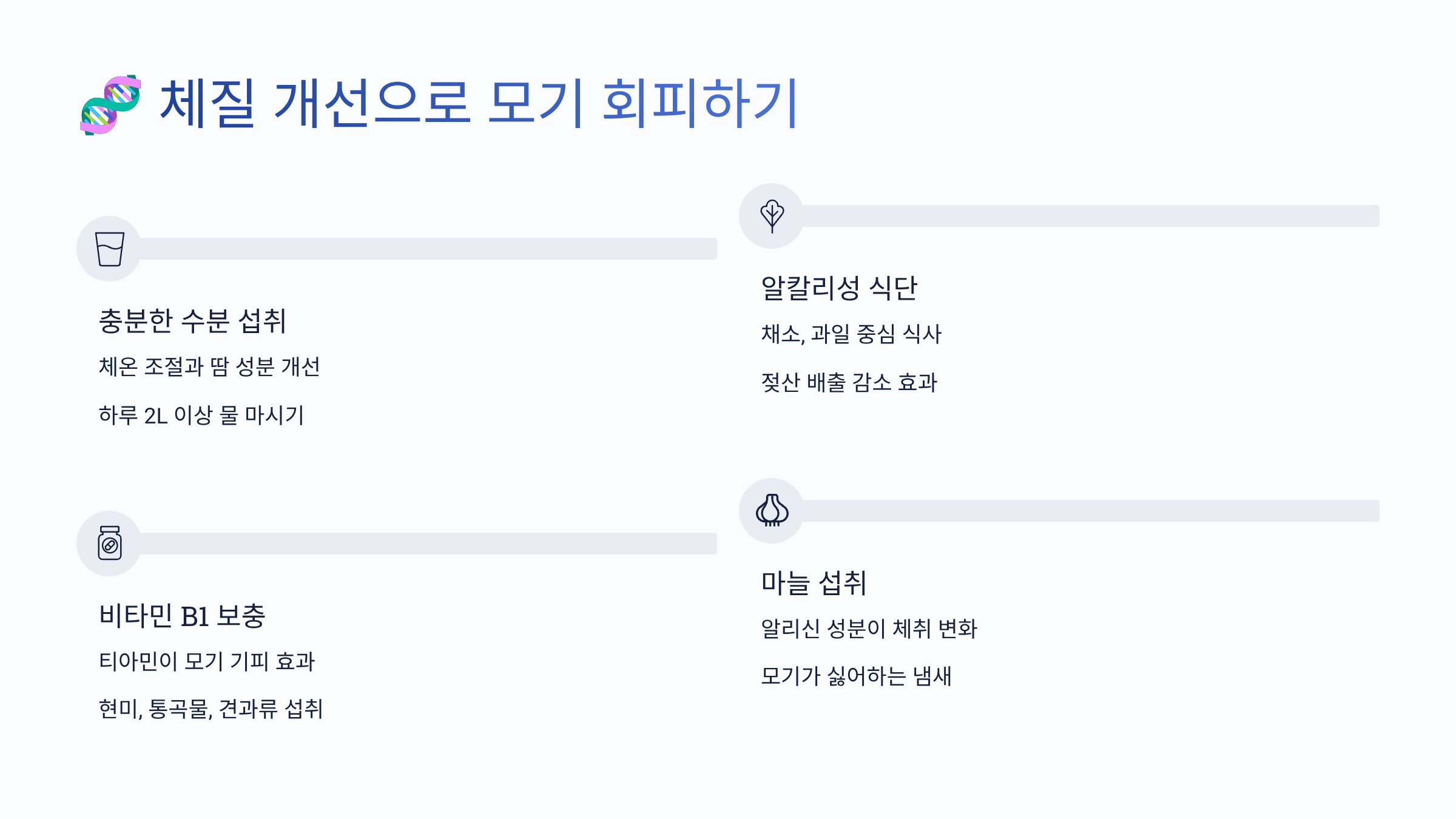 수분 섭취량을 늘리는 것도 중요해요. 충분한 수분 섭취는 체온을 낮추고 땀의 농도를 희석시켜 모기가 덜 매력적으로 느끼게 만들어요. 하루에 최소 2리터 이상의 물을 마시는 것을 추천해요. 특히 여름철에는 더 많은 수분 섭취가 필요하답니다. 레몬이나 라임을 넣은 물을 마시면 비타민 C도 보충할 수 있어 일석이조예요.