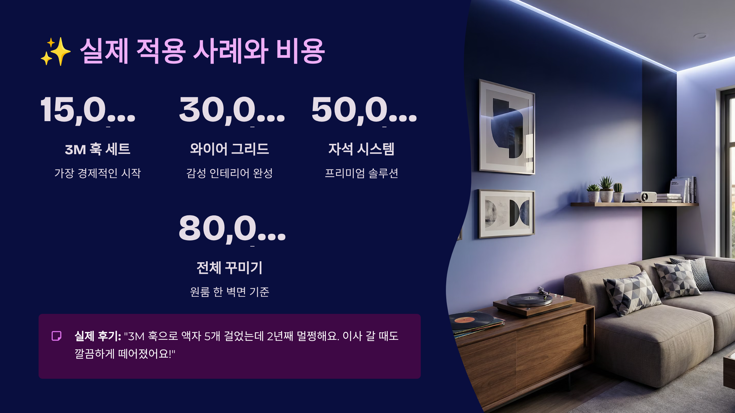 이론만 들으면 감이 안 오실 텐데, 제가 실제로 적용해 본 사례들을 공유해 드릴게요! 작년에 이사한 25평 아파트를 무타공으로만 꾸몄는데, 총비용이 30만 원도 안 들었어요. 기존 방식대로 했다면 인테리어 업체에 최소 200만 원은 줬을 거예요. 정말 큰 차이죠?