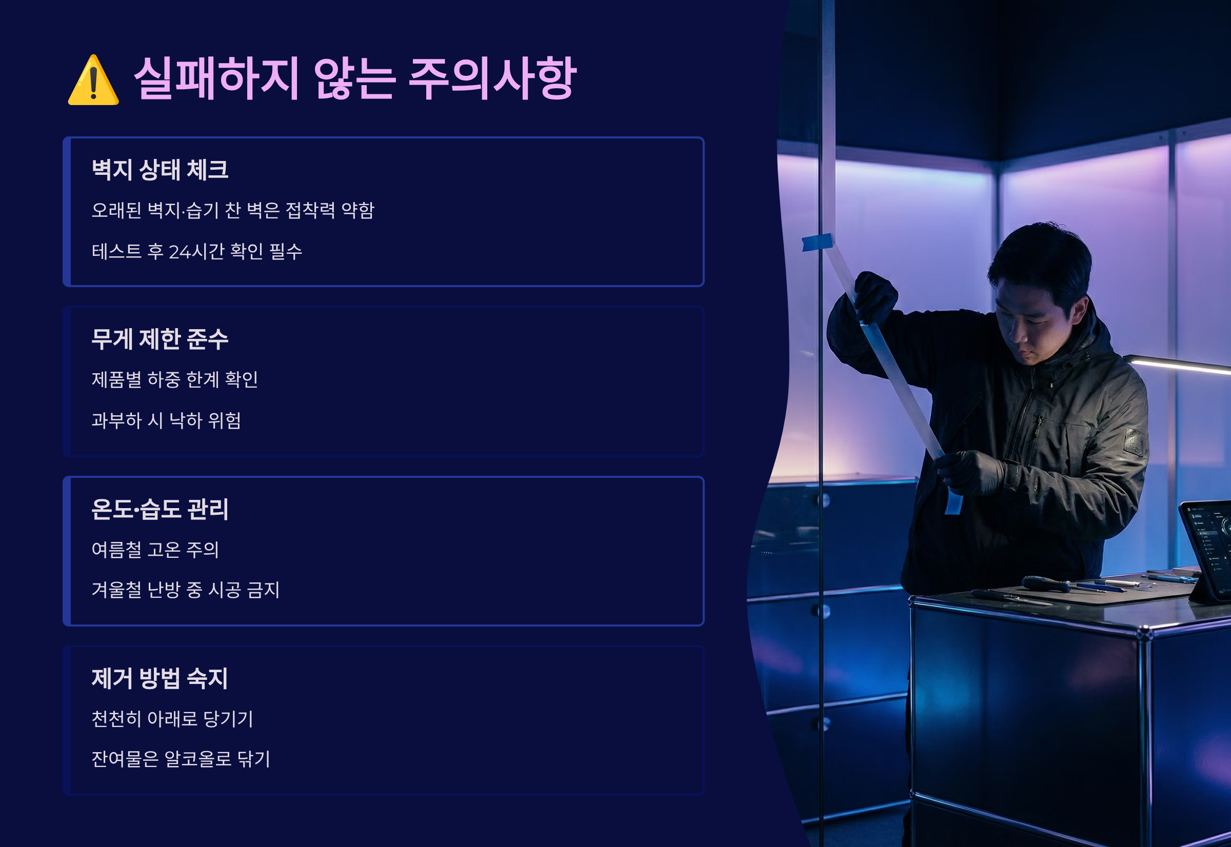 | 벽지 손상 | 잘못된 제거 | 45도 각도로 천천히 |