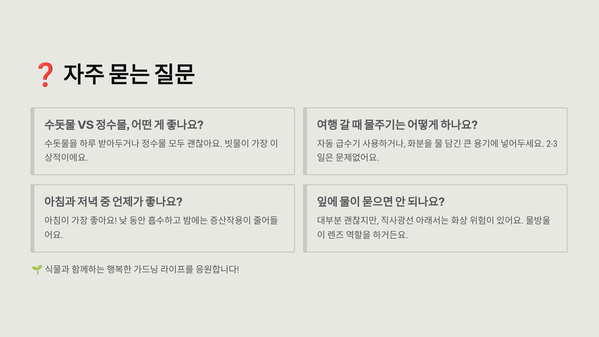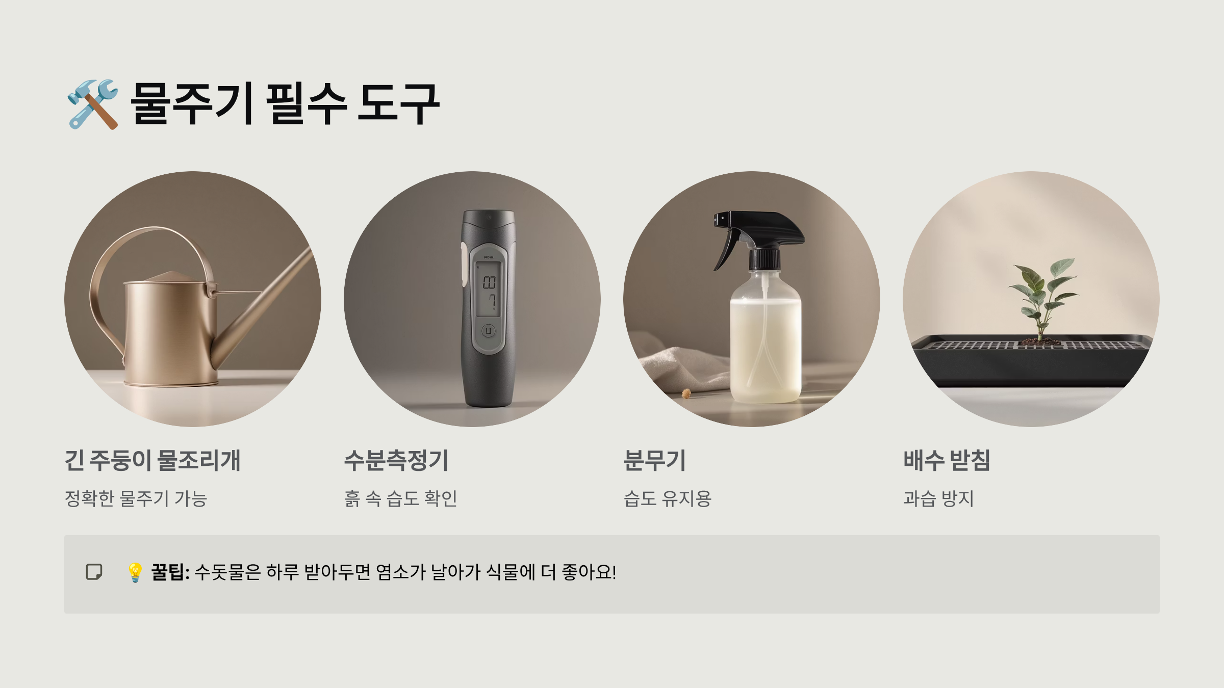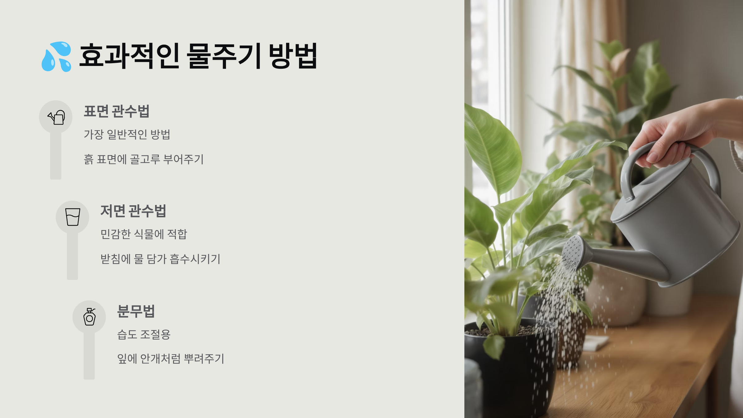 물 온도 조절도 중요한 테크닉이에요. 여름에는 시원한 물로, 겨울에는 미지근한 물로 주면 식물 스트레스를 줄일 수 있어요. 수돗물을 하루 정도 받아두면 염소도 날아가고 온도도 실온이 되어 일석이조랍니다.