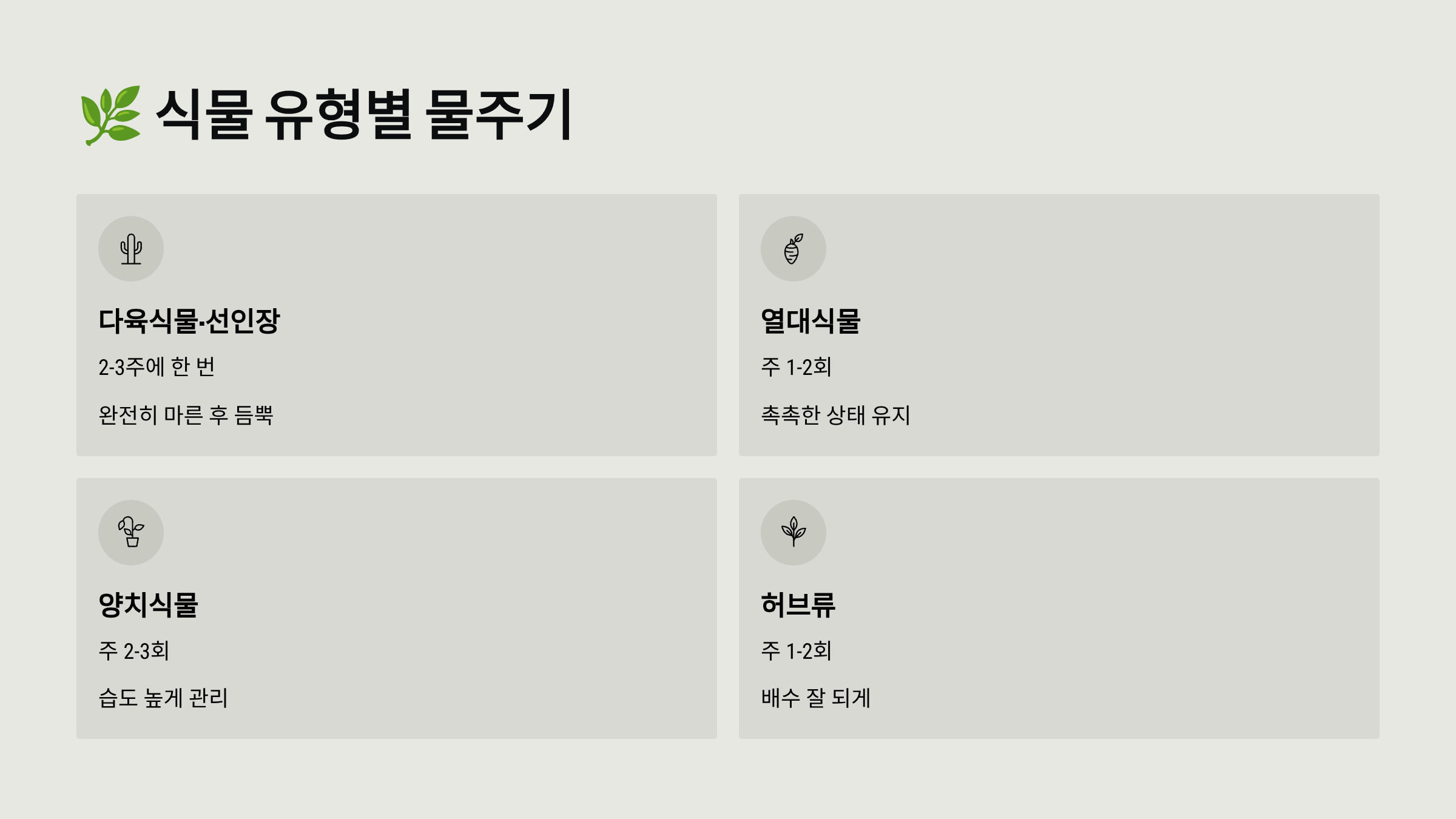 | 다육/선인장 | 2-4주 | 겨울 단수 |