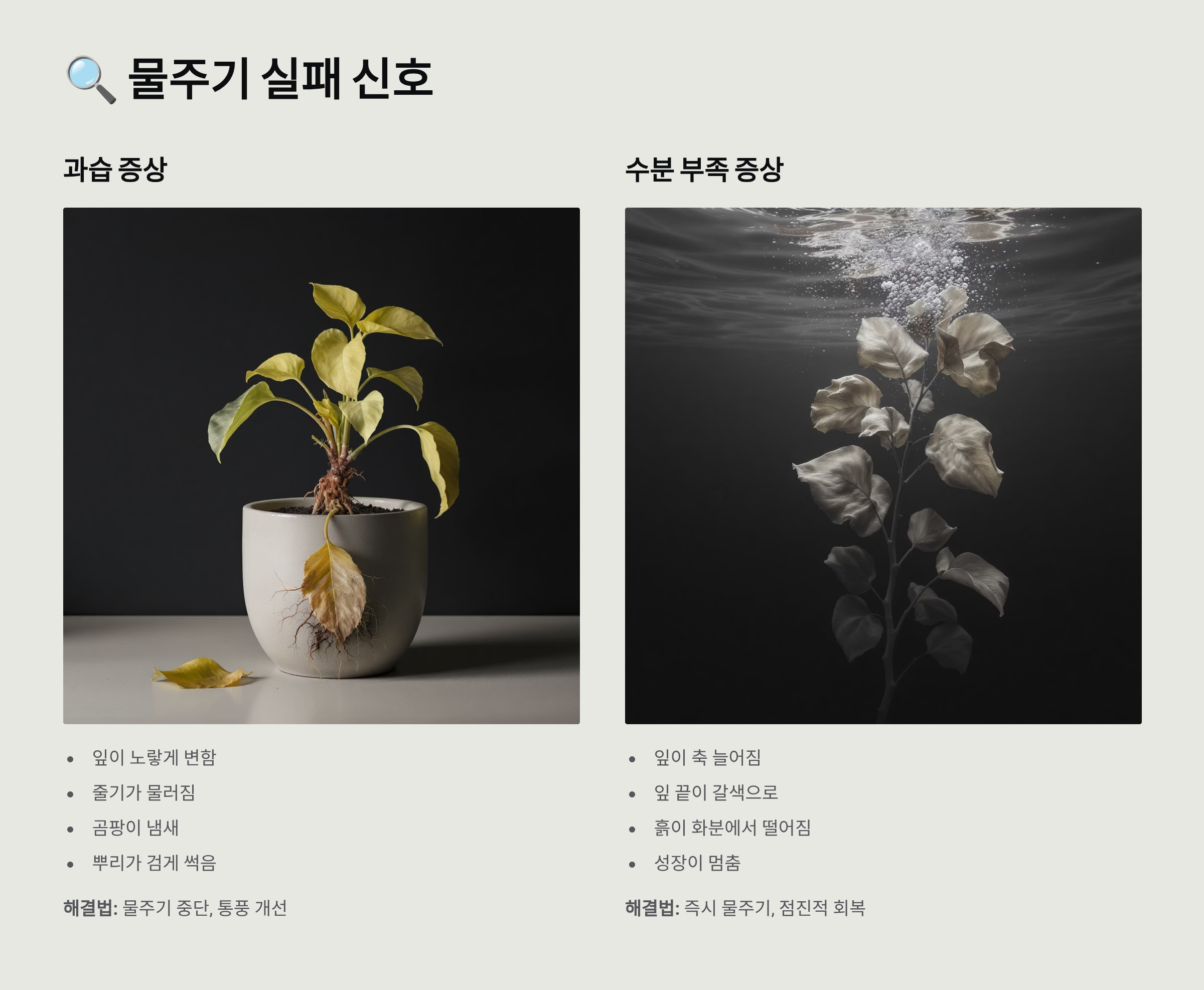 과습의 신호를 빨리 알아차려야 해요. 잎이 노랗게 변하고 물러지거나, 흙에서 곰팡이 냄새가 나고, 줄기 아래쪽이 검게 변한다면 과습이에요. 이럴 때는 즉시 물 주기를 중단하고 통풍이 잘되는 곳으로 옮겨주세요.