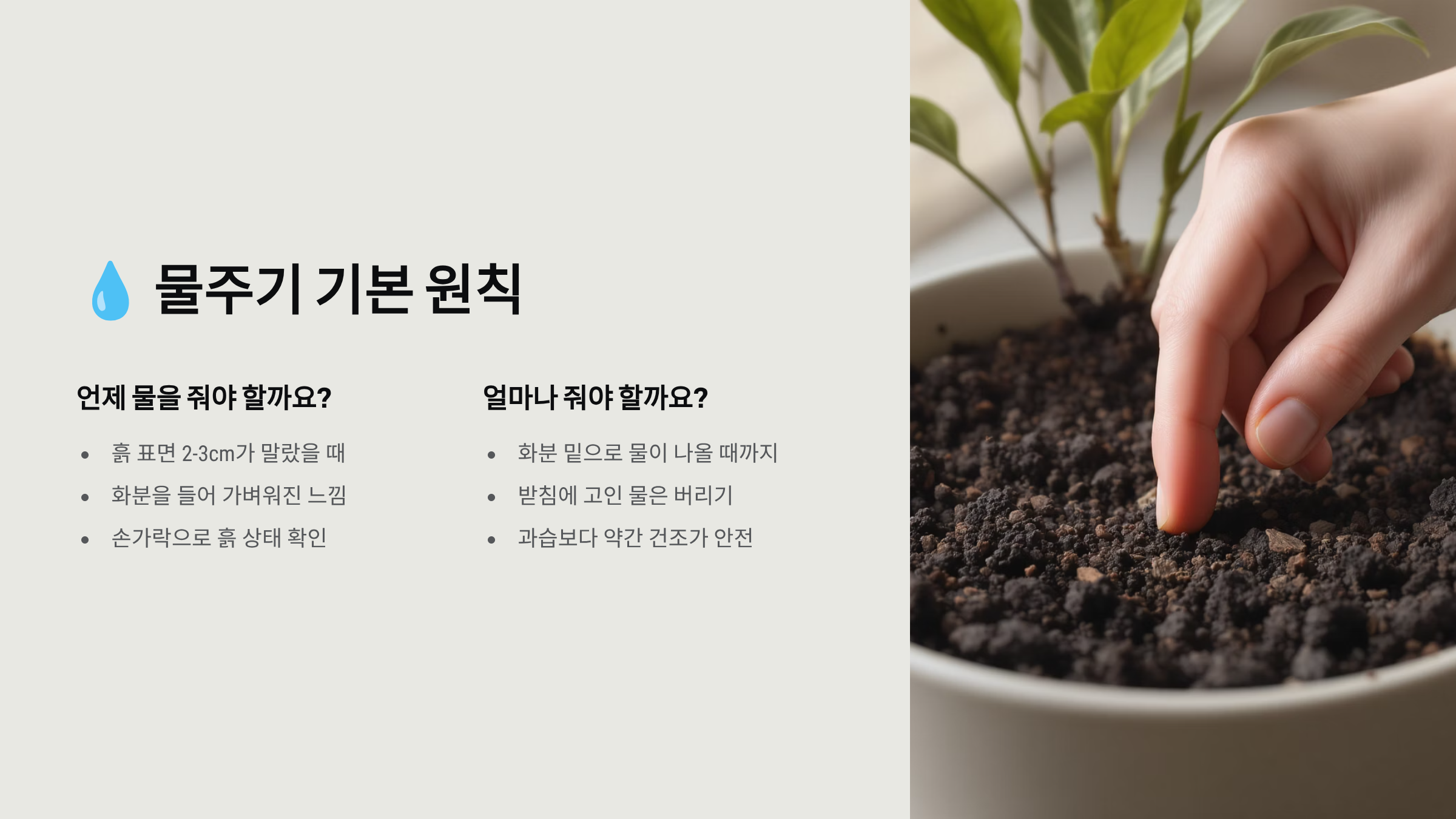 물 주기의 황금률은 '흙이 마르면 충분히 준다'예요. 손가락을 흙에 2-3cm 정도 넣어봤을 때 건조하다면 물을 줄 타이밍이랍니다. 이 간단한 방법이 제일 정확해요. 화분 무게로 판단하는 방법도 있는데, 물을 준 직후와 흙이 마른 상태의 무게 차이를 기억해 두면 좋아요.