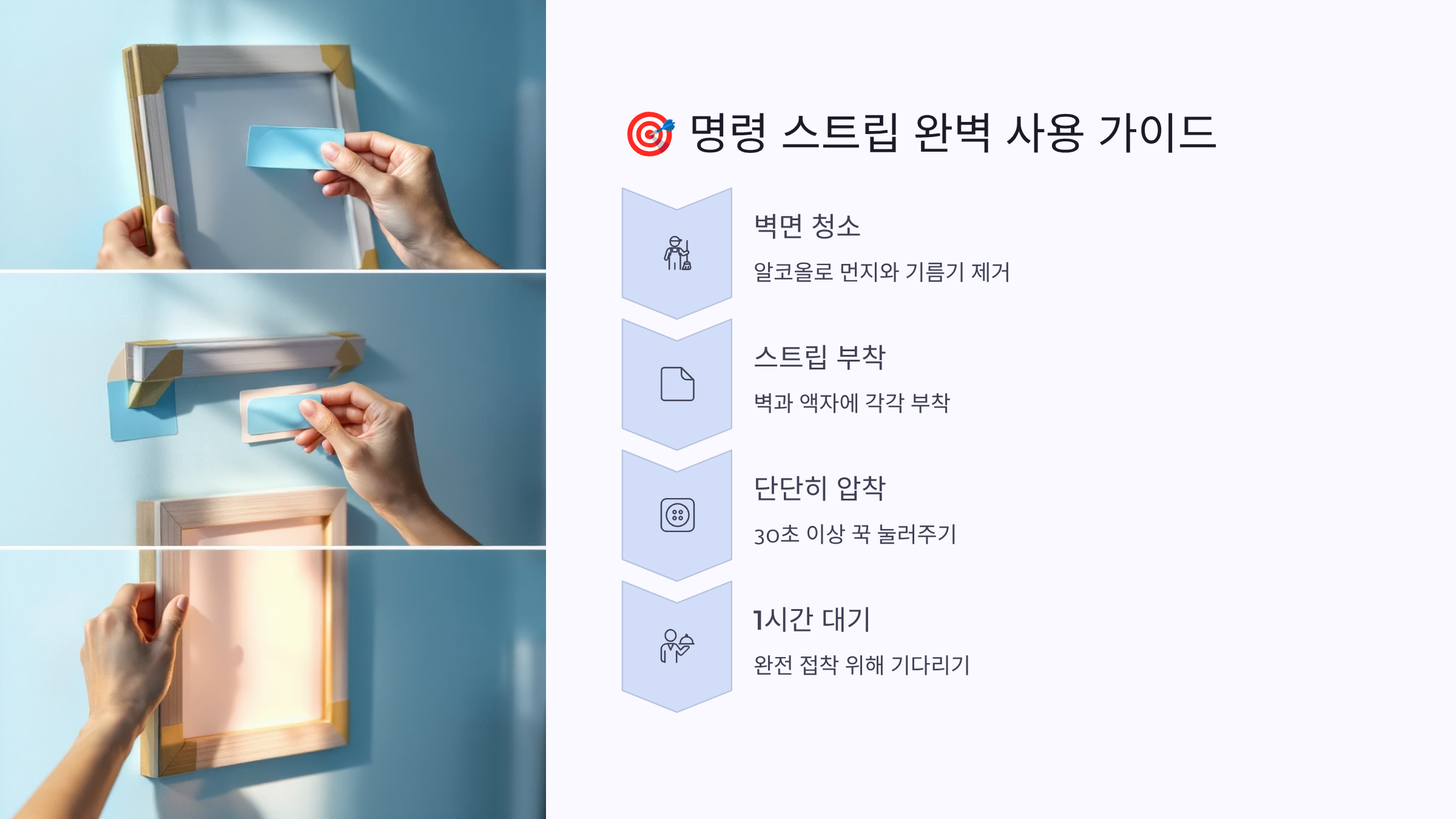 사용법은 정말 간단해요! 먼저 알코올로 벽면과 액자 뒷면을 깨끗이 닦아주세요. 스트립 두 개를 서로 맞물려 찰칵 소리가 날 때까지 눌러준 다음, 분리해서 한쪽은 벽에, 한쪽은 액자에 붙이면 돼요. 30초 이상 꾹 눌러준 후 1시간 정도 기다렸다가 액자를 거는 것이 좋아요. 🎯