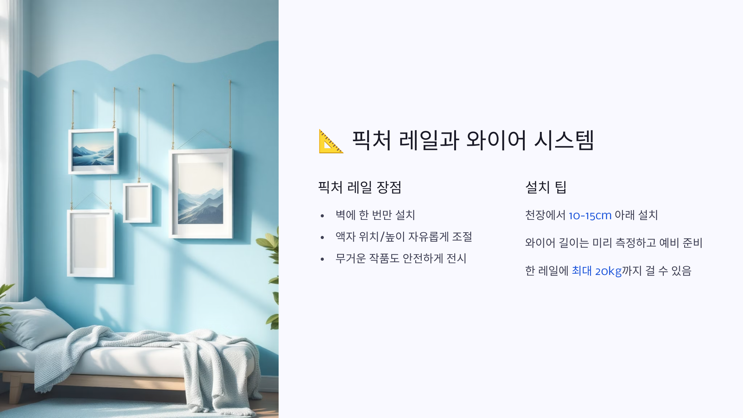 픽처 레일의 장점은 정말 많아요! 여러 개의 액자를 일렬로 깔끔하게 정렬할 수 있고, 계절이나 기분에 따라 액자를 쉽게 교체할 수 있어요. 청소할 때도 액자를 옆으로 밀기만 하면 되니까 편리해요. 조명을 함께 설치하면 갤러리 같은 분위기를 만들 수 있어요.