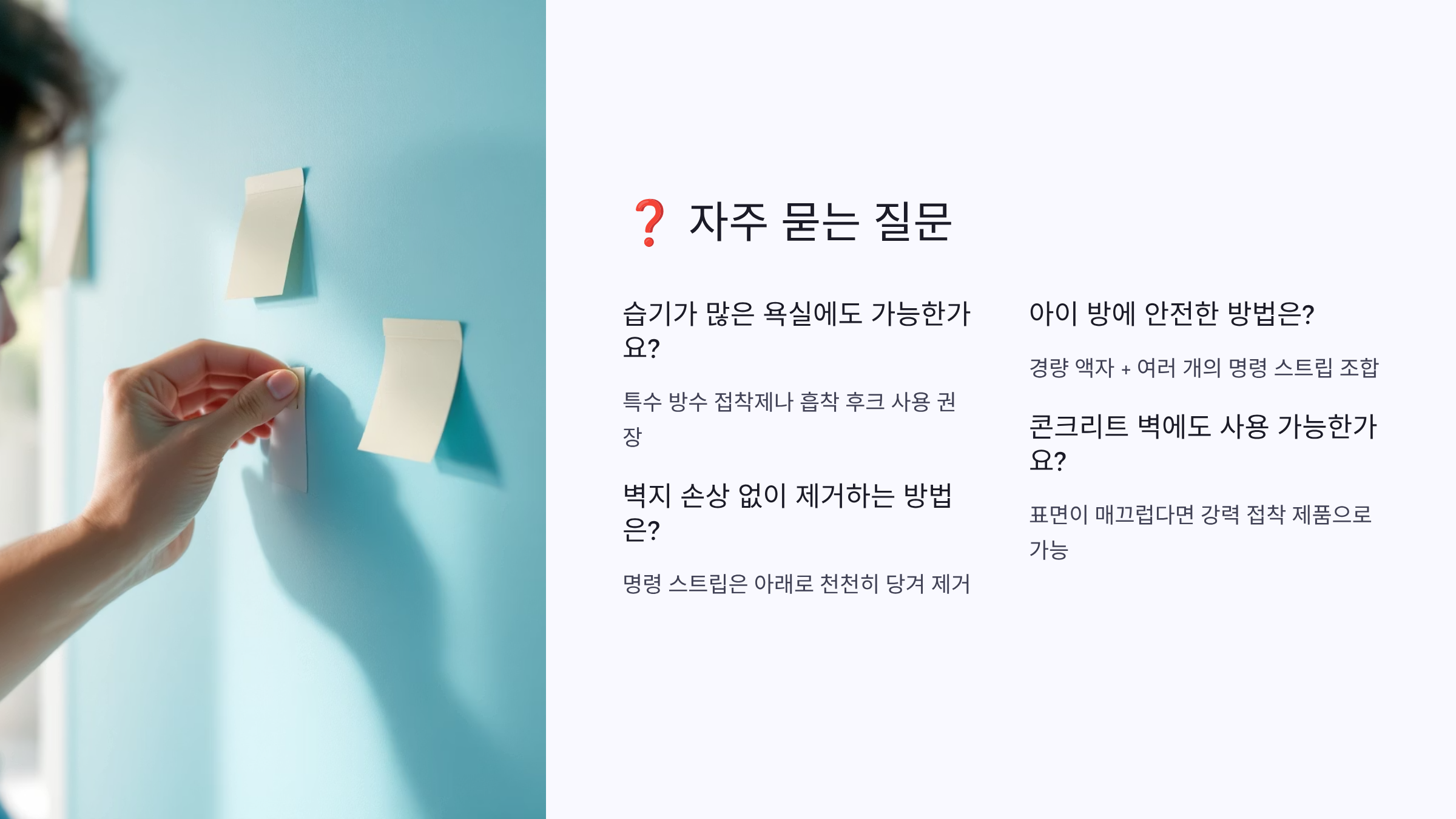 A1. 3M 명령 스트립이 가장 안전해요! 제거할 때 스트립이 늘어나면서 떨어지는 방식이라 벽지 손상이 거의 없어요. 다만 실크 벽지나 종이 벽지는 피하고, 비닐 코팅된 벽지에 사용하세요. 제거할 때는 천천히 일정한 속도로 당기는 것이 중요해요! 😊