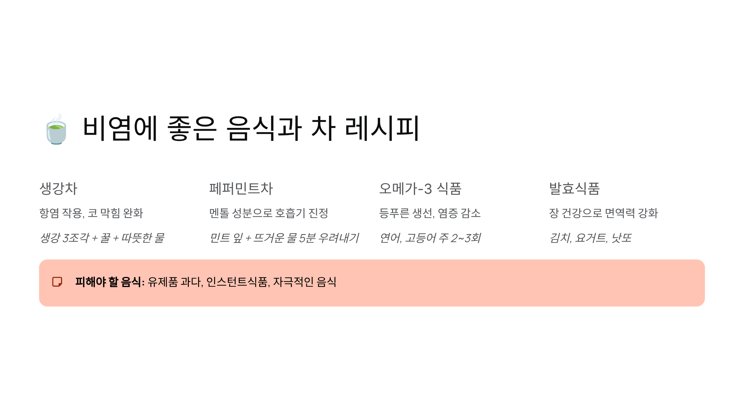 | 생강차 | 진저롤 | 항염증, 코막힘 완화 | 하루 2-3잔 |
