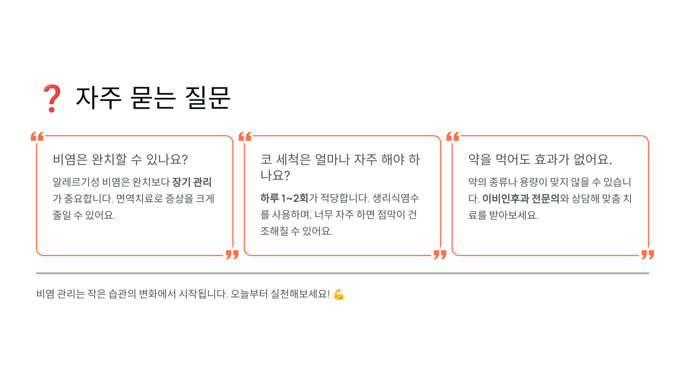 이 글은 일반적인 정보 제공을 목적으로 작성되었으며, 의학적 조언을 대체할 수 없습니다. 개인의 건강 상태는 모두 다르므로, 비염 증상이 지속되거나 악화되는 경우 반드시 전문의와 상담하시기 바랍니다. 본 정보를 활용한 자가 치료로 인한 결과에 대해서는 책임지지 않습니다.