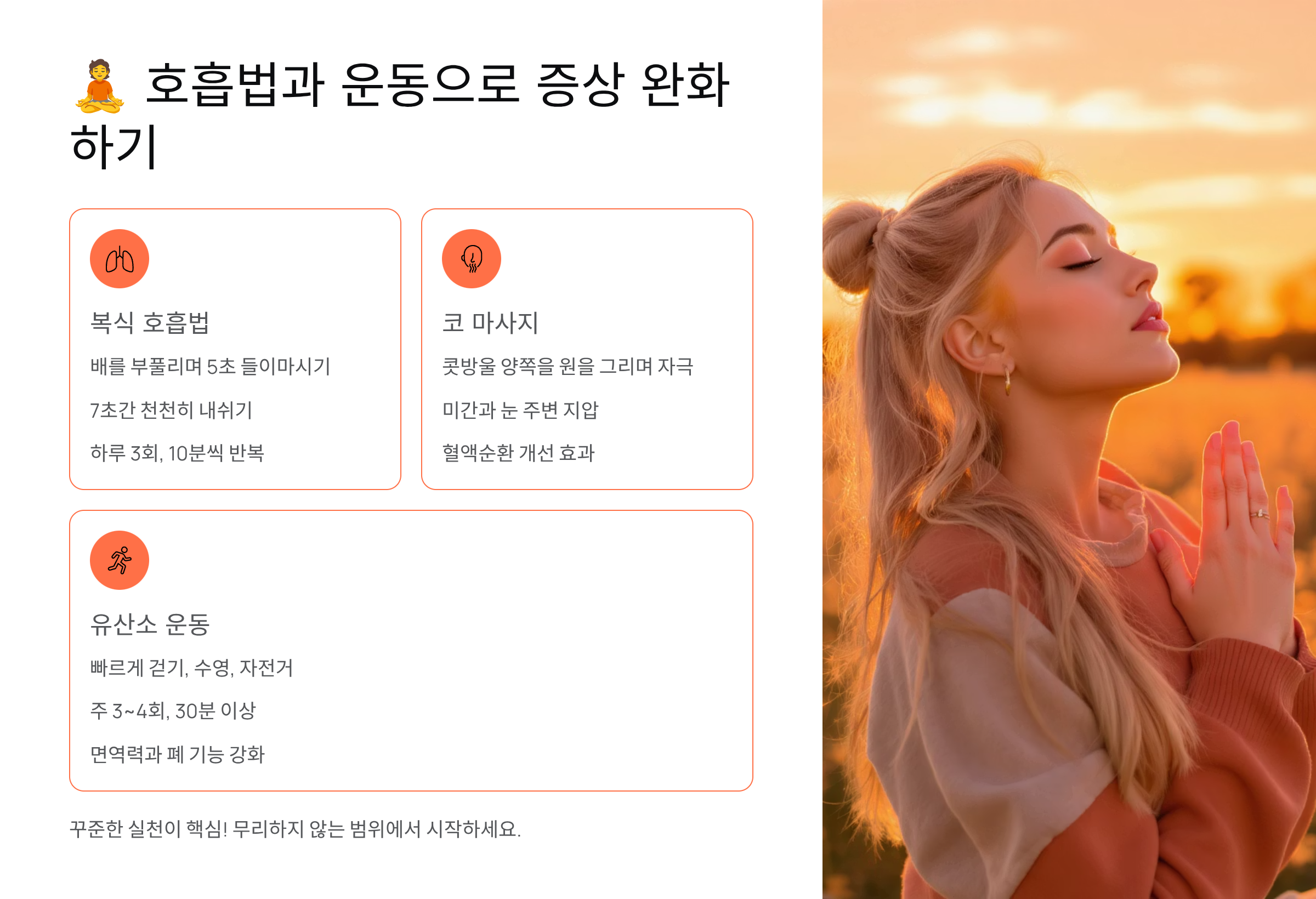 올바른 호흡법은 비염 증상 완화에 큰 도움이 돼요. 복식호흡은 폐활량을 늘리고 코막힘을 개선해 줘요. 편안한 자세로 앉아한 손은 가슴에, 다른 손은 배에 올리세요. 코로 천천히 4초간 숨을 들이마시면서 배를 부풀리고, 입으로 6초간 천천히 내쉬면서 배를 들어가게 하세요. 하루 10분씩 3회 연습하면 호흡이 편해진답니다.