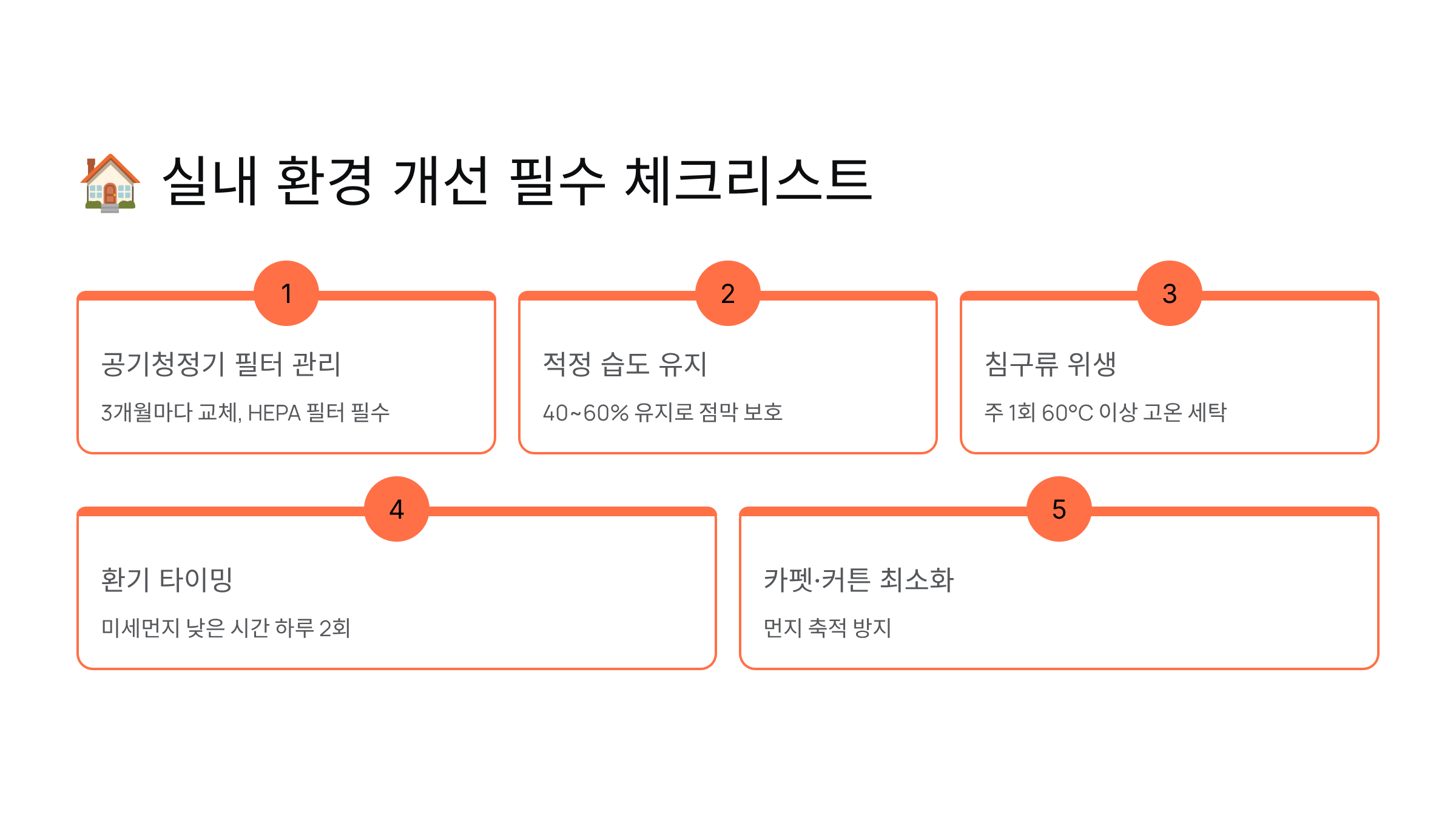 계절별 관리 포인트도 달라요. 봄에는 꽃가루 차단을 위해 방충망에 필터를 설치하고, 여름에는 에어컨 필터를 자주 청소해 주세요. 가을에는 낙엽과 곰팡이 포자에 주의하고, 겨울에는 실내 습도 관리에 신경 써야 해요. 난방기구 사용 시 가습기를 함께 사용하되, 과도한 가습은 피하세요.
