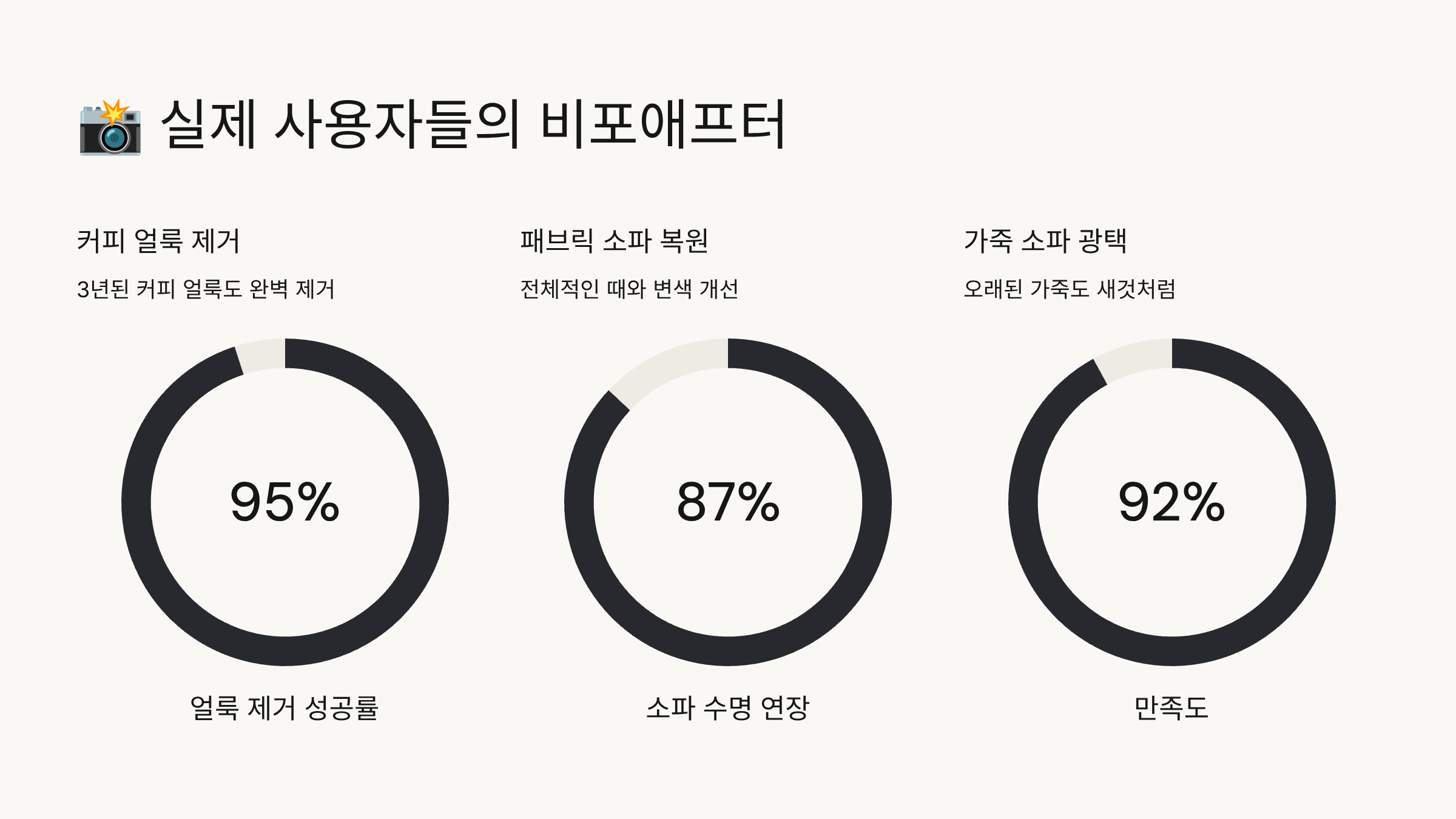 첫 번째는 3살 아이를 키우는 김민정 씨 사례예요. 아이가 초콜릿을 묻히고 크레용으로 그림을 그려서 소파가 엉망이었대요. 포기하고 새 소파를 알아보던 중 이 방법을 알게 됐어요. 단 2시간 만에 완전히 새 소파가 됐답니다!