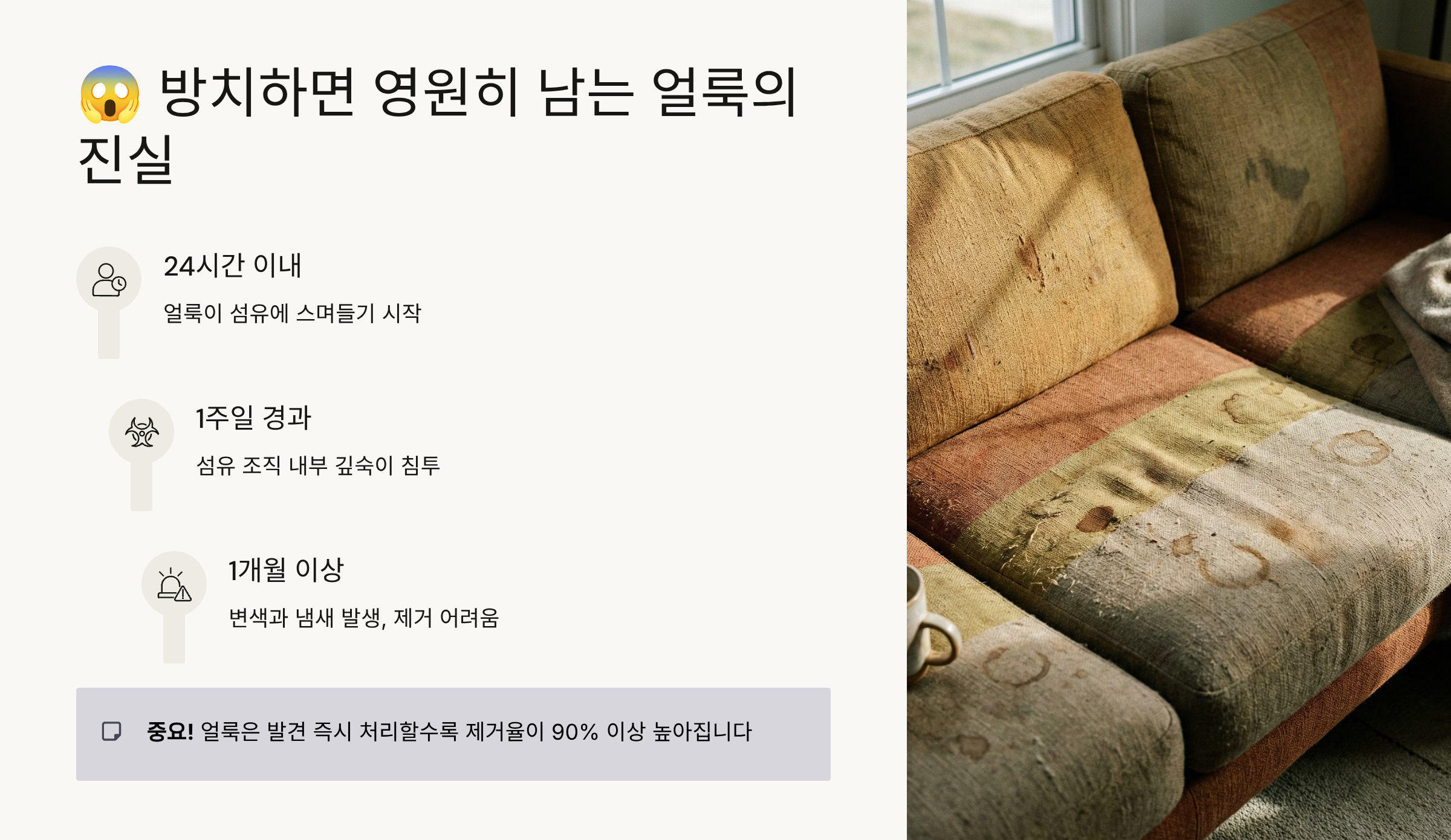 | 얼룩 종류 | 골든타임 | 방치시 결과 |