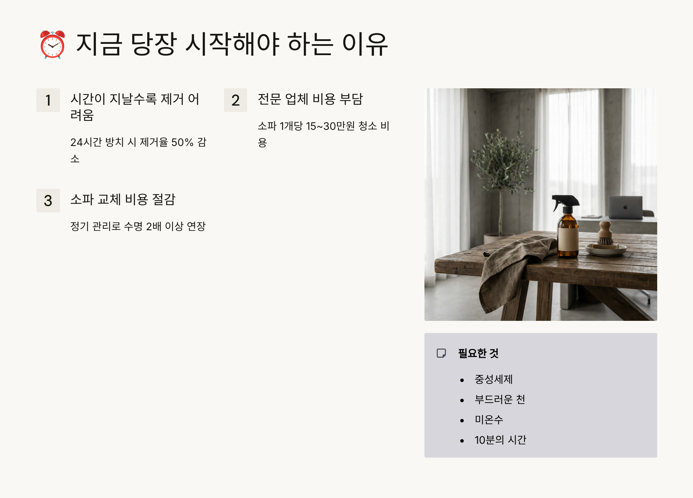 ✅ 수명 연장: 정기 관리로 소파 수명 2배 이상 연장 (5년→10년 이상)