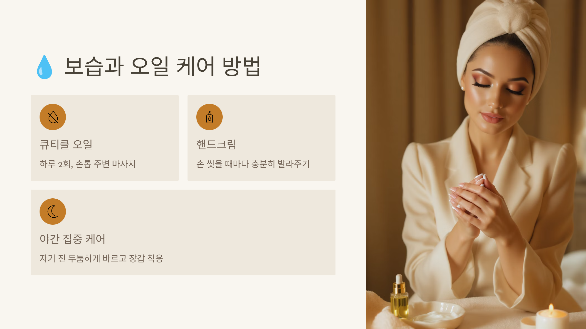 | 큐티클 오일 | 보습과 영양 공급 | 하루 2회 이상 도포 |