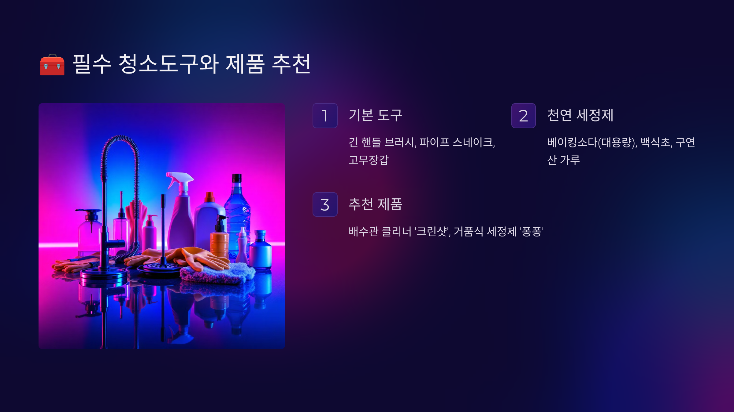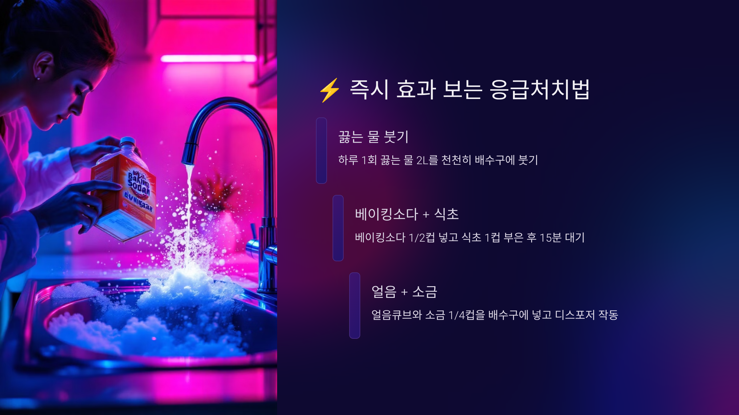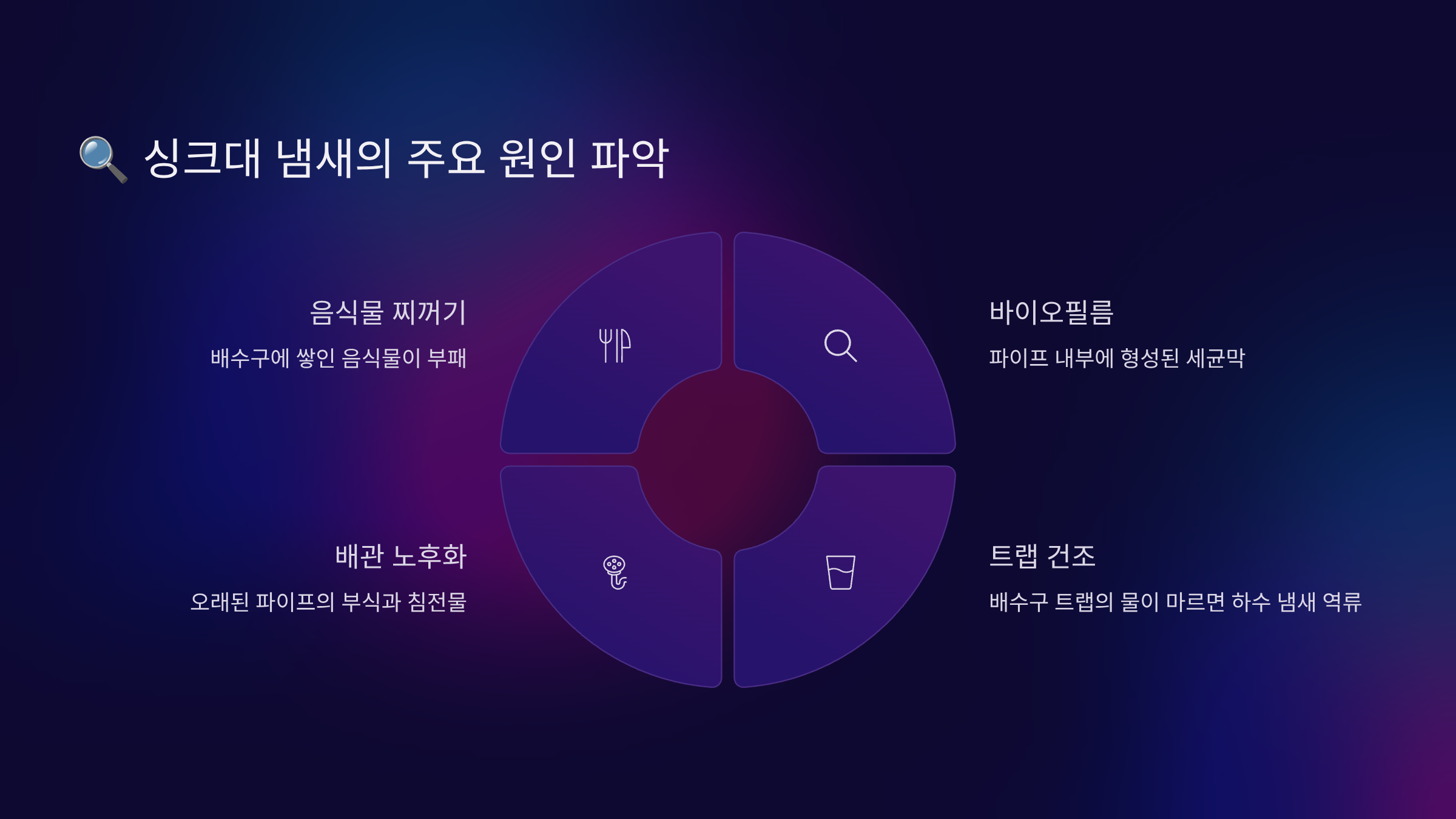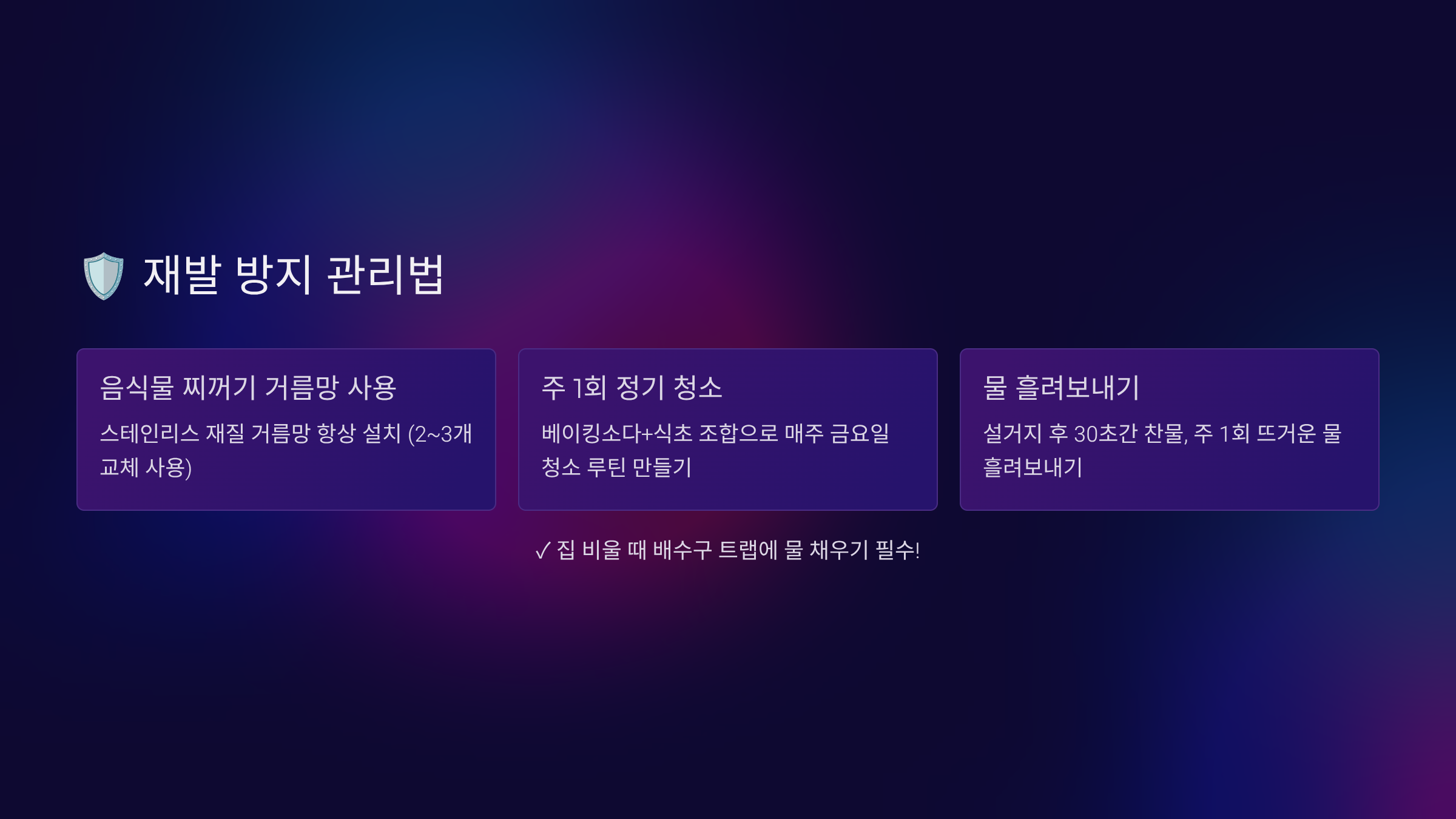 | 배수구 방치 | 세균 번식, 악취 | 매일 간단 청소 |
