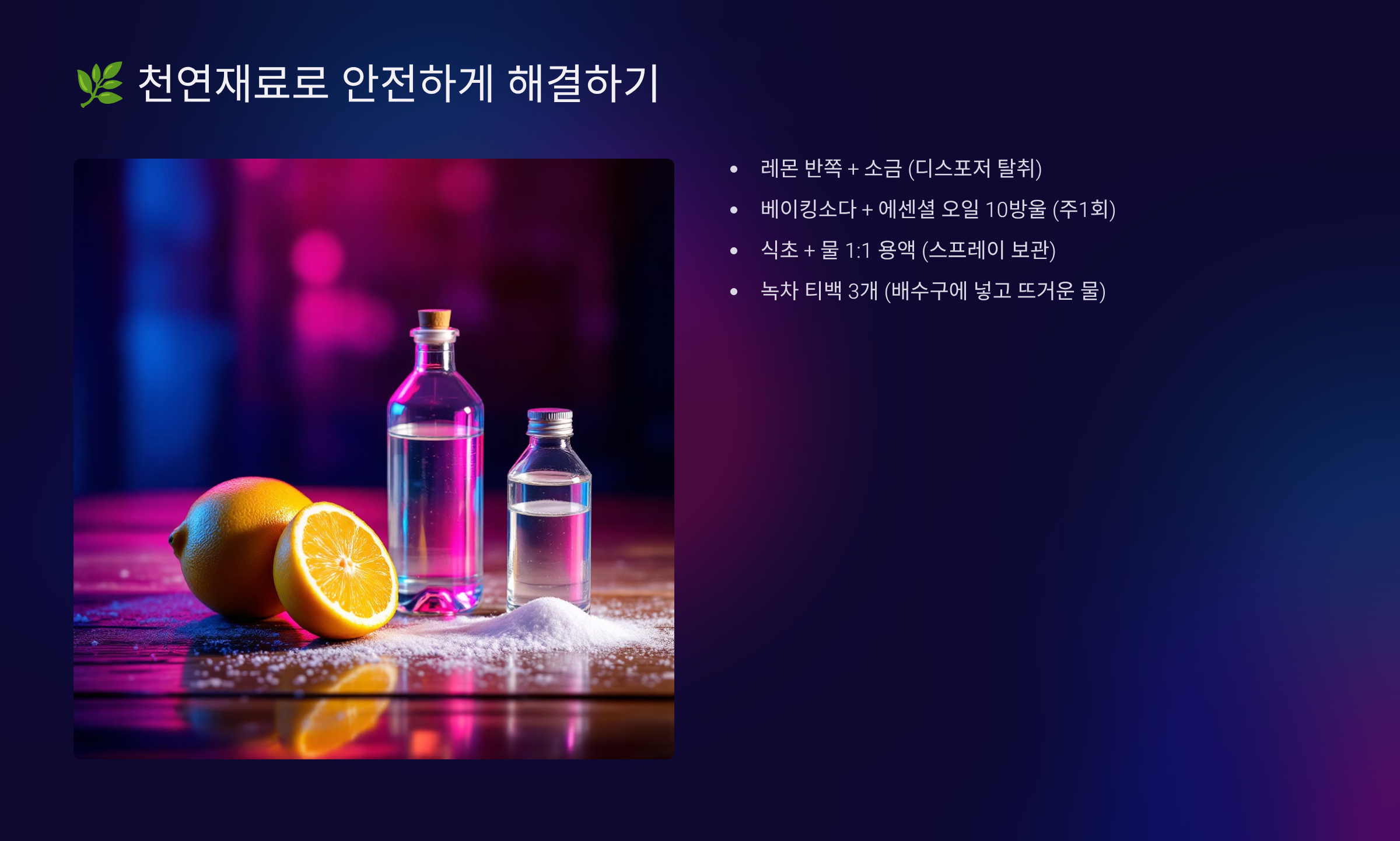 화학 세제가 걱정되시는 분들을 위해 100% 천연 재료만으로 싱크대 냄새를 잡는 방법을 소개할게요. 아이가 있는 집이나 반려동물을 키우는 집에서도 안심하고 사용할 수 있는 방법들이에요. 제가 생각했을 때 천연 재료의 가장 큰 장점은 자주 사용해도 부담이 없다는 거예요.