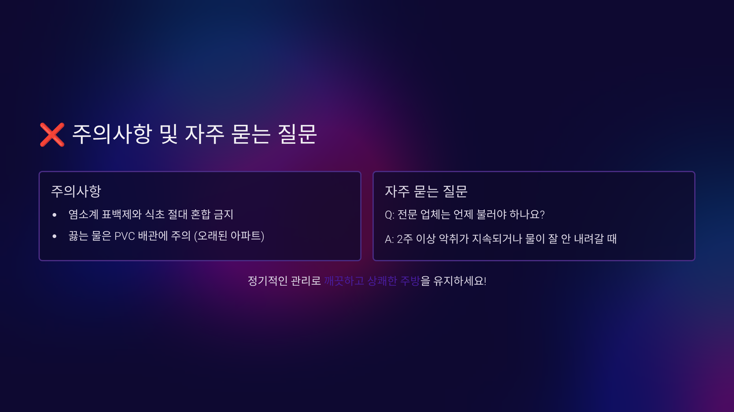 | 락스 원액 사용 | 배관 부식, 유독가스 | 10배 희석 사용 |