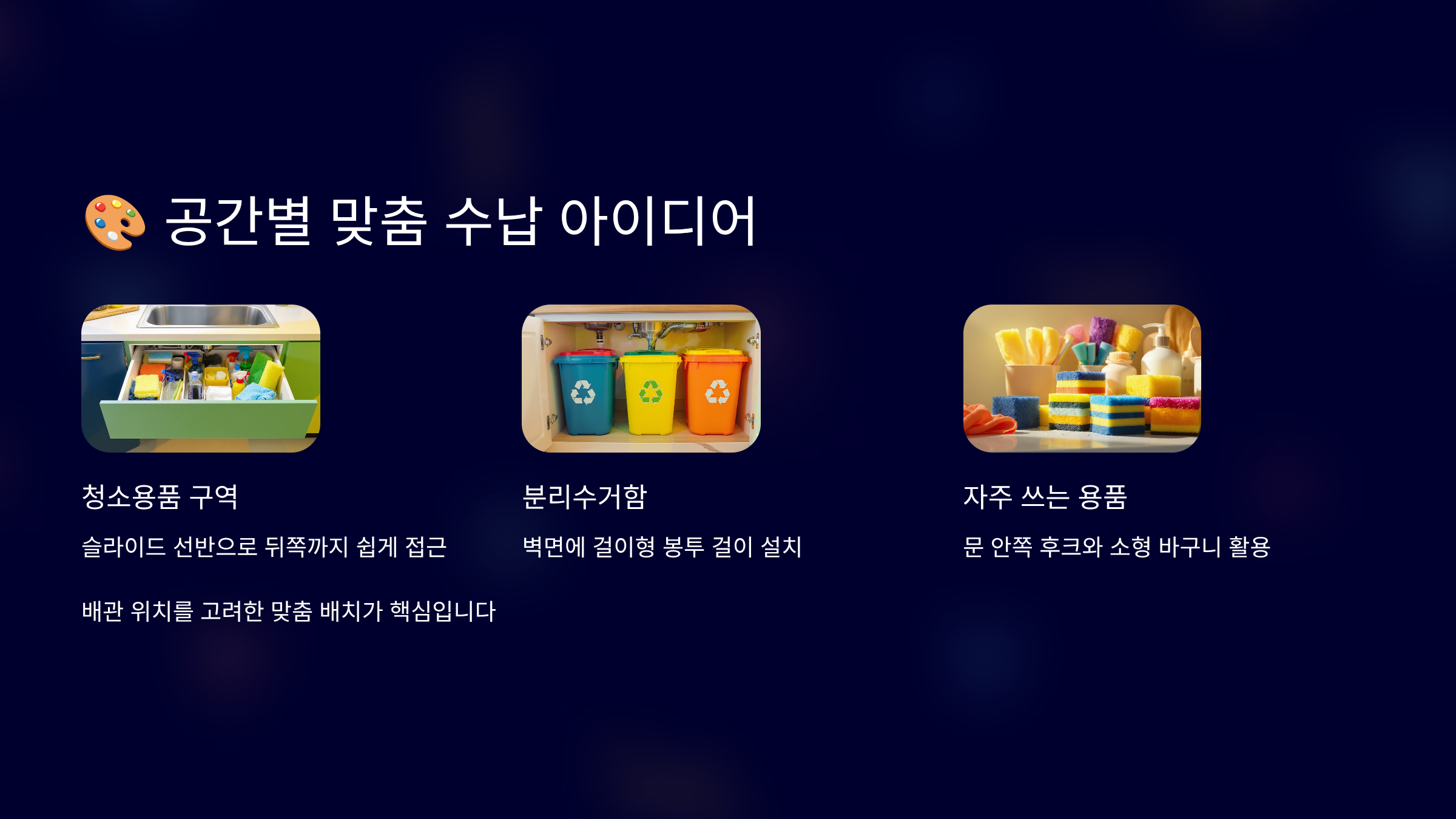 본 글은 일반적인 싱크대 밑 정리 방법을 안내한 것으로, 개별 가정의 상황에 따라 적용 방법이 달라질 수 있습니다. 전문적인 정리 컨설팅이 필요한 경우 전문가와 상담하시기 바랍니다.