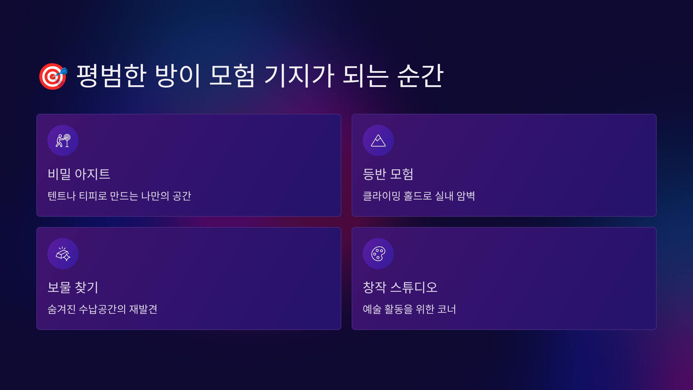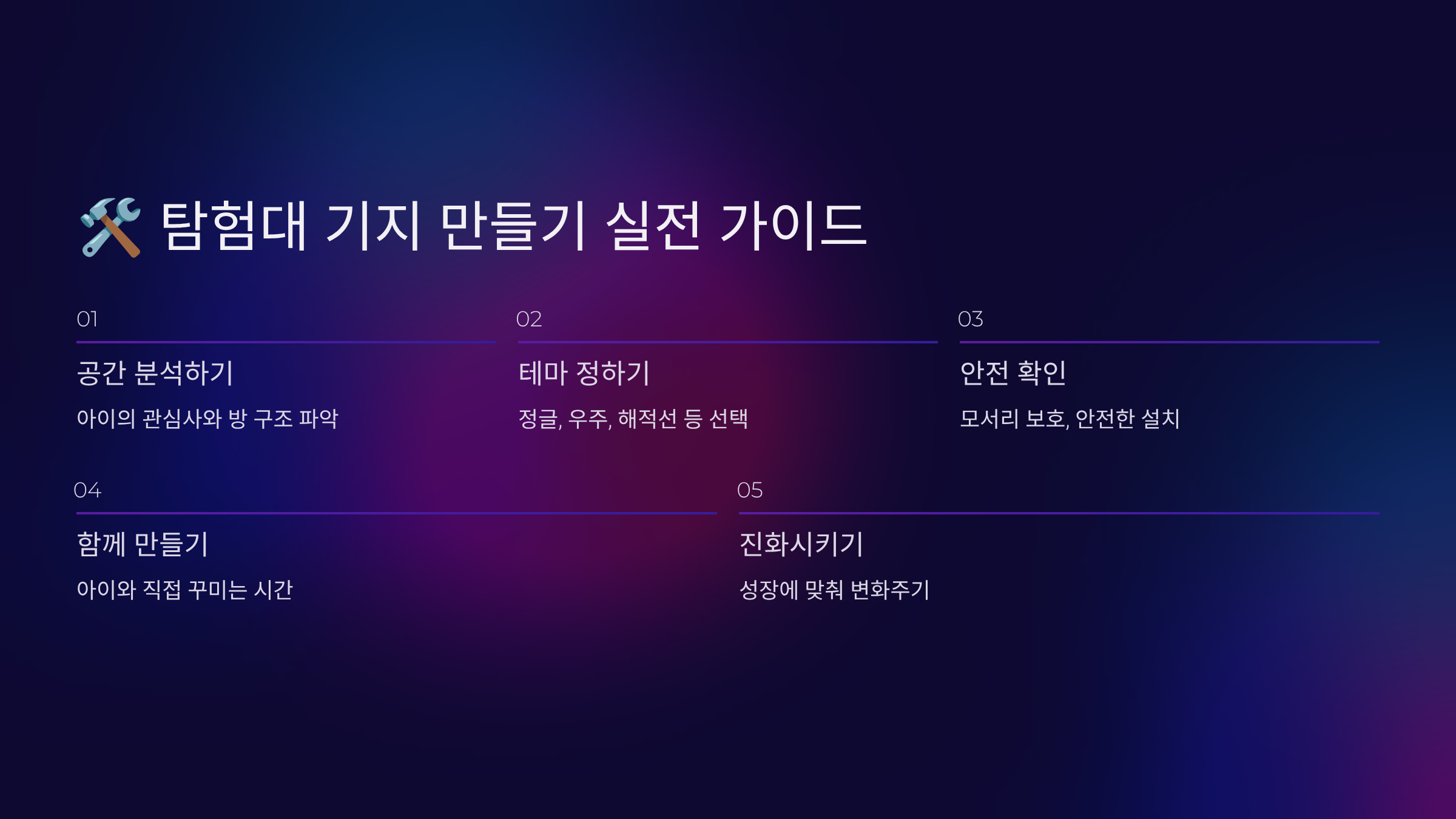 아이들의 상상력은 무한해요. 평범한 침실이 하루아침에 우주선이 되고, 해적선이 되고, 정글 탐험 기지가 되죠. 하지만 많은 부모님들이 "어떻게 시작해야 할지 모르겠어요"라고 말씀하시더라고요. 오늘은 제가 직접 경험하고 연구한 아이방 탐험대 기지 만들기의 모든 것을 공유해 드릴게요! 🚀