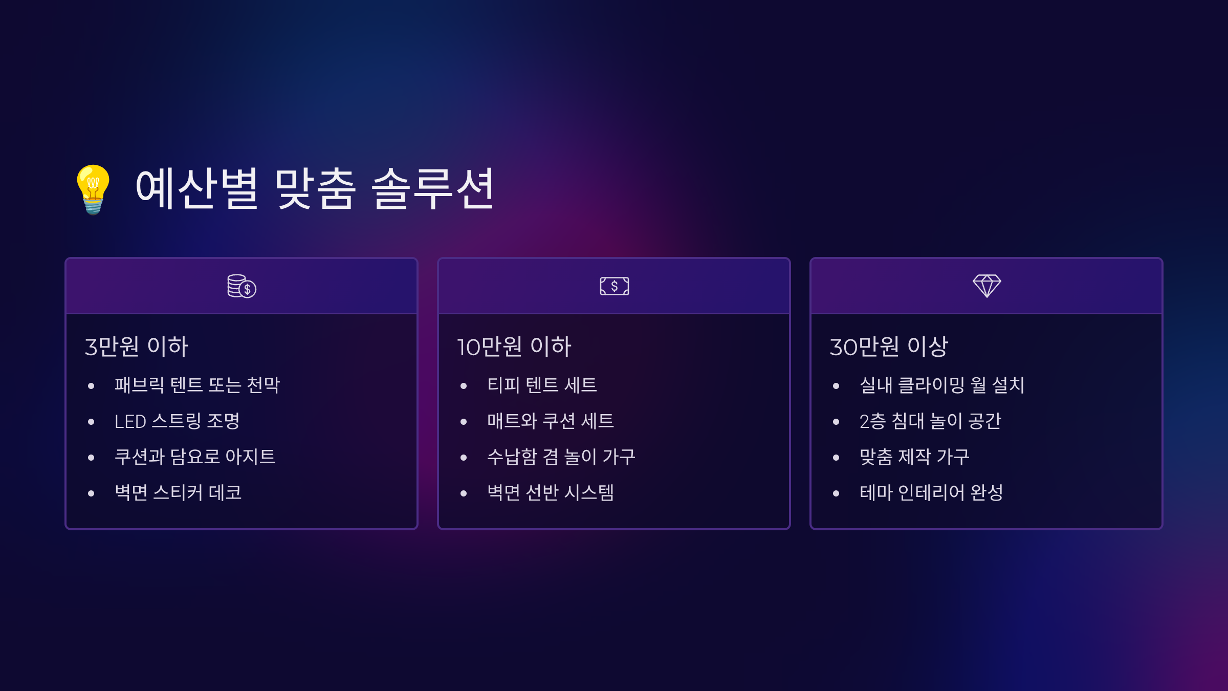 10-20만 원 프리미엄 버전은 더욱 완성도 높은 공간을 만들 수 있어요. 캐노피 침대 커튼(5만 원), 프로젝터 무드등(3만 원), 플레이 매트(3만 원), 벽선반(2만 원), 다양한 소품과 장식(5만 원) 등을 구비할 수 있죠. 이 정도 투자하면 아이방이 완전히 다른 공간으로 변신해요!